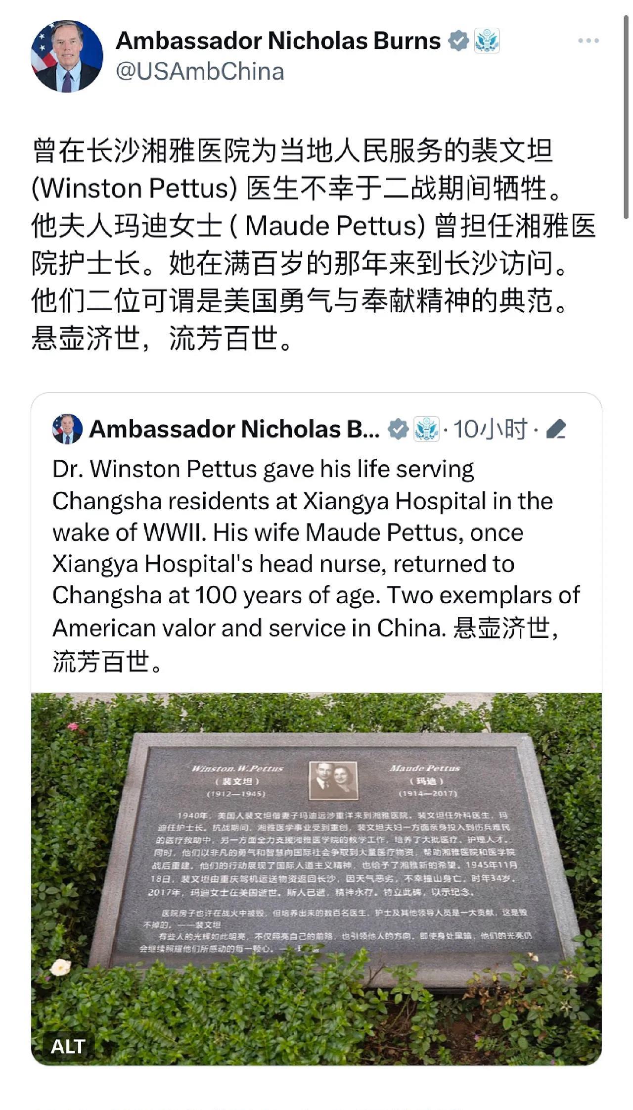 人在长沙的美国驻华大使伯恩斯昨晚(9月8日晚)写道:“曾在长沙湘雅医院为当地人民服务的裴文坦 (Winston Pettus) 医生不幸于二战期间牺牲。他夫人玛迪女士 ( Maude Pettus) 曾担任湘雅医院护士长。她在满百岁的那年来到长沙访问。他们二位可谓是美国勇气与奉献精神的典范。悬壶济世,流芳百世。”