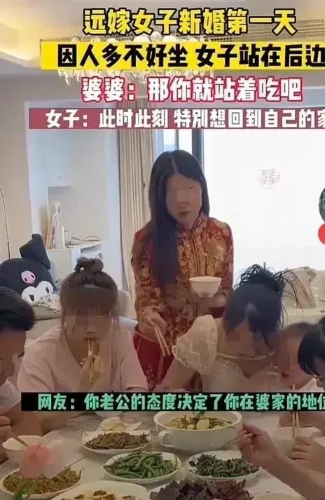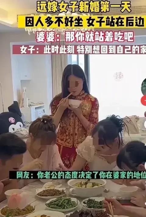 可爱的姑娘,赶紧摔碗,掀桌子走人吧! 在你人生中最重要的一天,也是女人二次投胎的这一天,你居然承受了这样的委屈,真是替你不值得。 这就是婆家人的态度吗? 刚结婚,礼服都没脱下,就站着吃饭了?关键是看看其他人低头吃饭时的无视表情,真是让人心寒。 你爸妈看到了,该有多心疼,谁还不是个宝贝? 新郎呢,也在埋头吃饭吗?婆婆呢,也没有关照吗?这样的家庭氛围,能过得舒心吗? 赶紧收拾收拾,回自己家吧,相信你的爸妈肯定也在想你。 大家觉得这种婚姻,还有必须吗?让他们一家子好好吃吧。