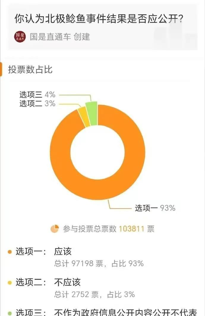 #超9成网友认为北极鲶鱼应公布结果#真正的统计结果是,只有3%的被调查对象,认为深圳市运输管理局可以不公开不回复。剩下93%的被调查对象认为应该公开,4%的被调查对象认为可以再等等看表现。那么面对如此群意昂昂的结果。深圳市运输管理局应该如何回复呢?