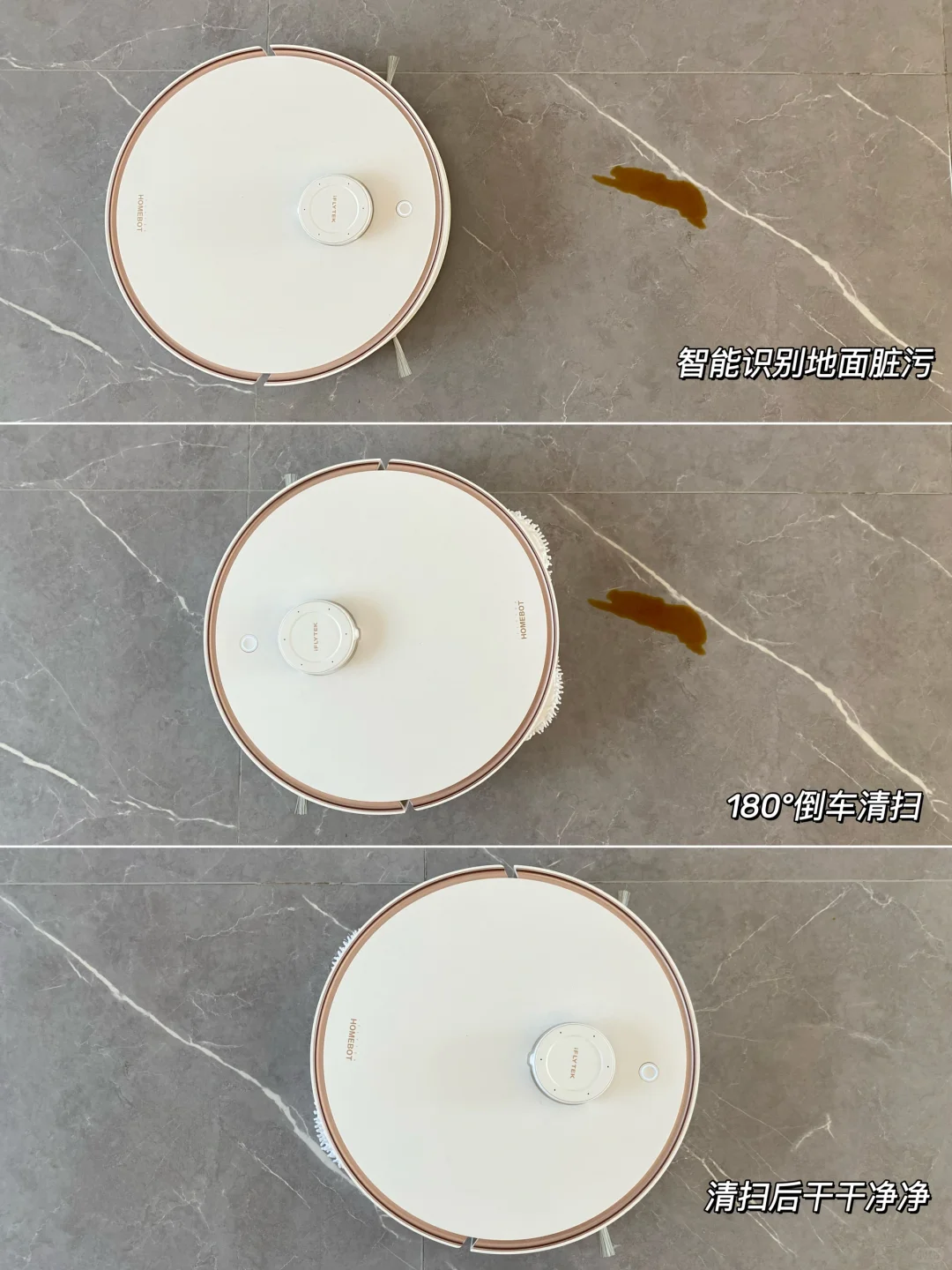 能识别液体,倒车清扫的扫地机你见过吗?它简直是个大聪明,像咖啡、牛奶这些液体污渍,掉转机身,用拖布先拖再扫,如果是凝固了的酱油这种顽固污渍,它会反复拖扫到干净为止,再也不担心液体脏污弄脏机器里的尘盒了。