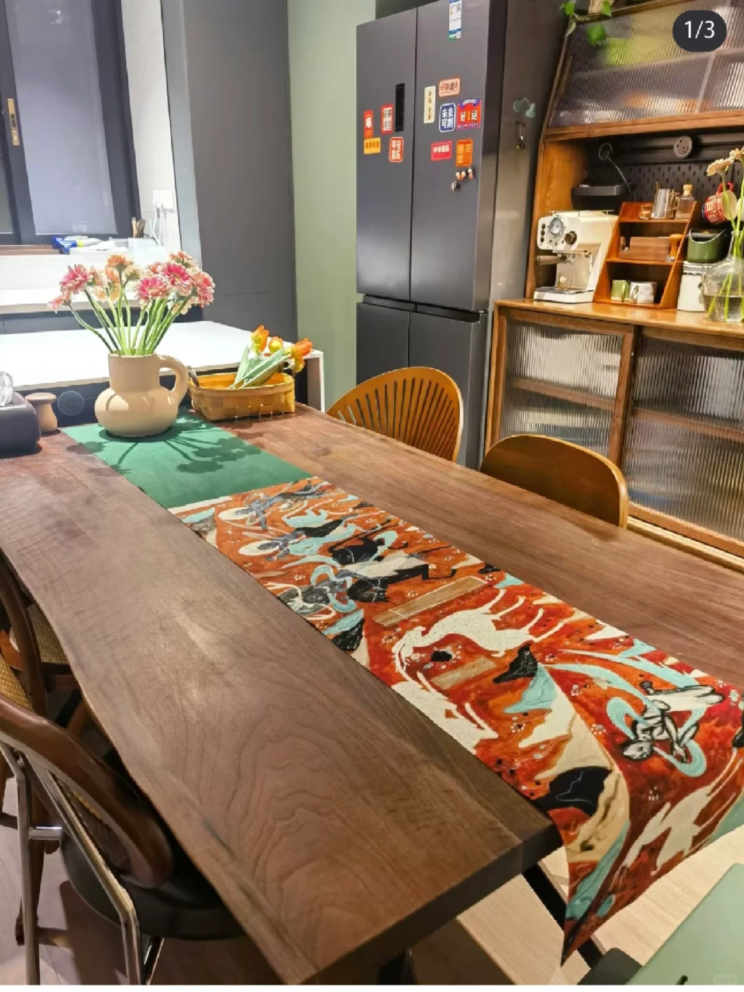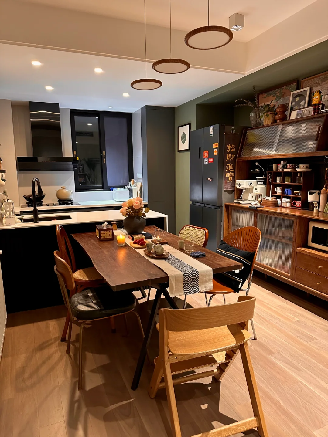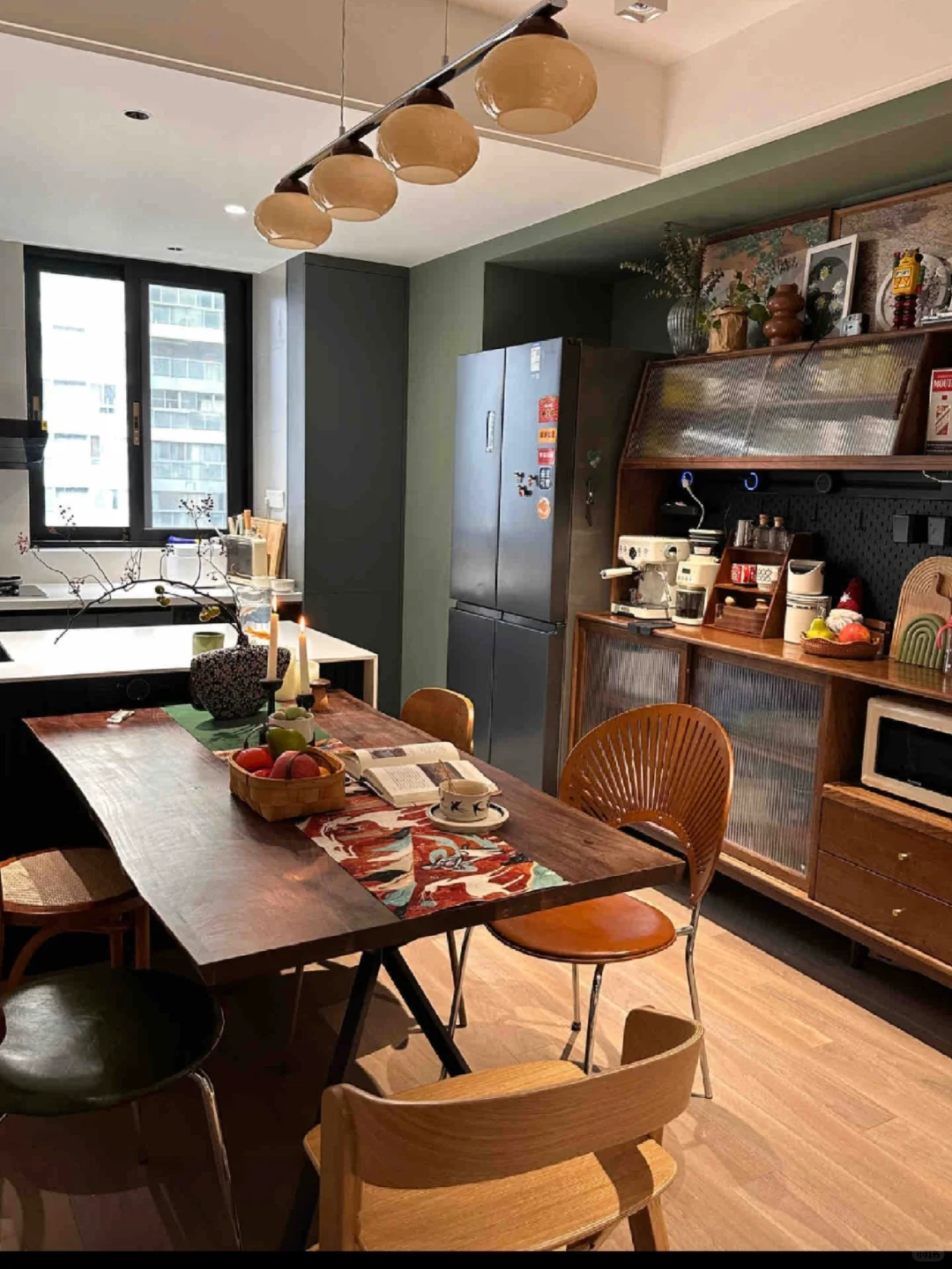 买桌子的历程很艰辛,原来定制的红橡木材质,好看但是整体不搭!改成黑胡桃历时两个月,才等到原始自然边!厂图拍的水波纹很明显,四块各不相同,网友们劝退的很多,但是最终因为自己心里的喜欢多一点,留下了!果然人靠衣装,桌子也靠软装摆件,把黑胡桃自身的贵族气质都散发出来,今天这种风格明天那种风格,百变风格自己动手!
