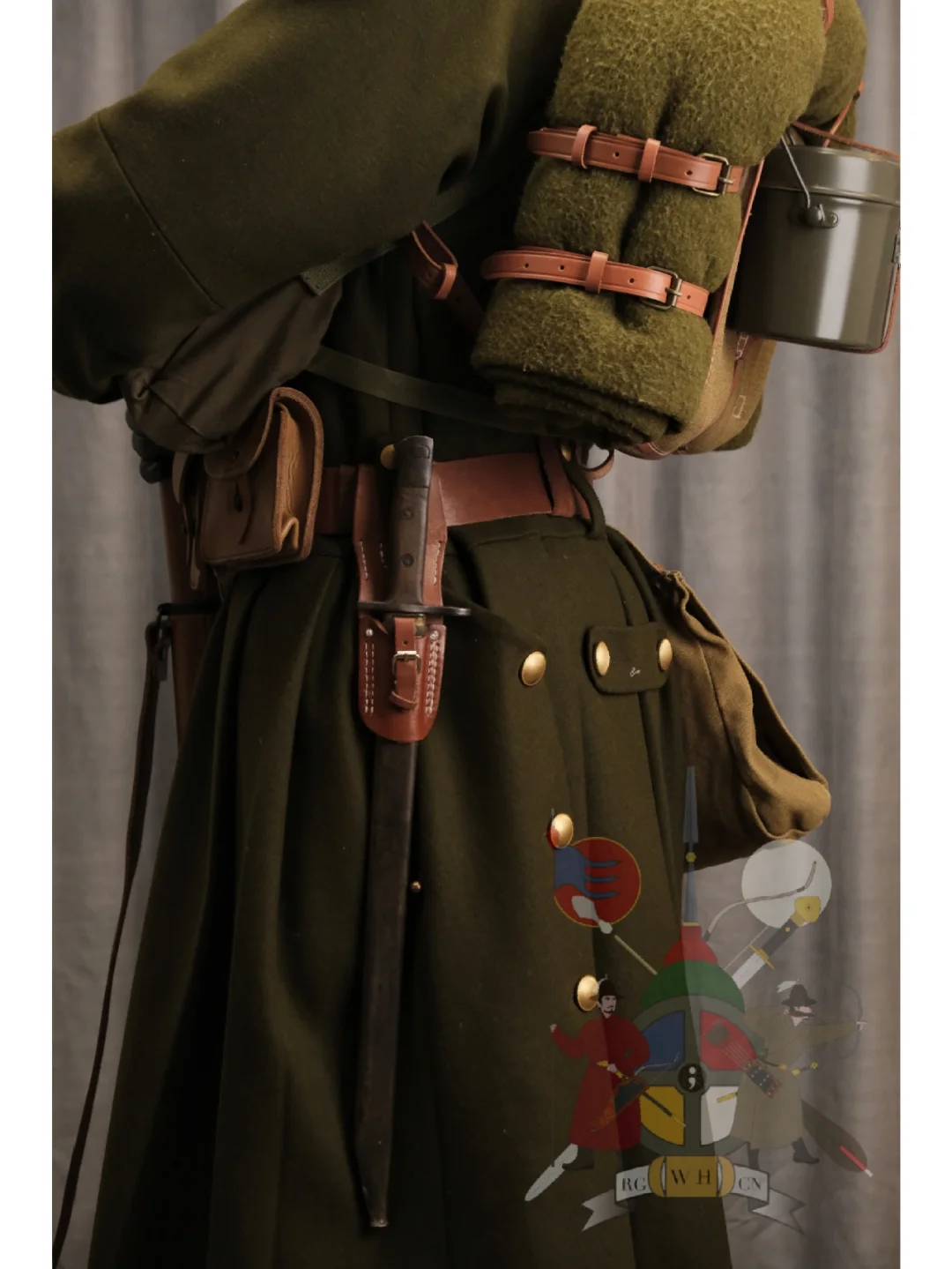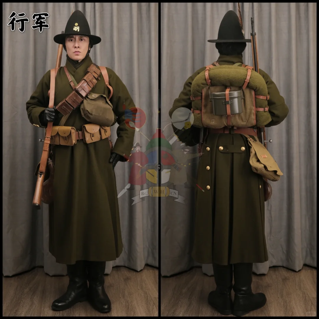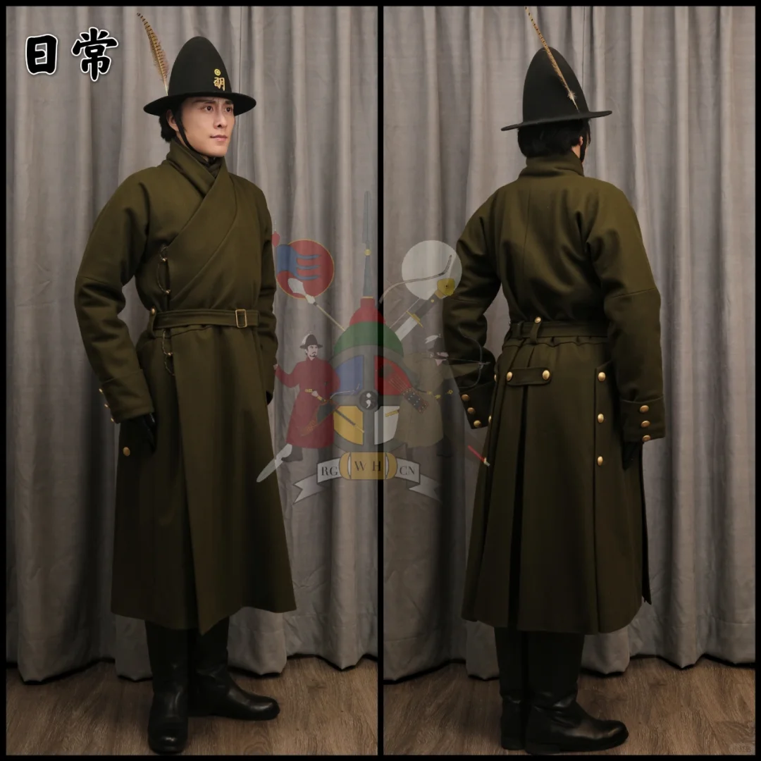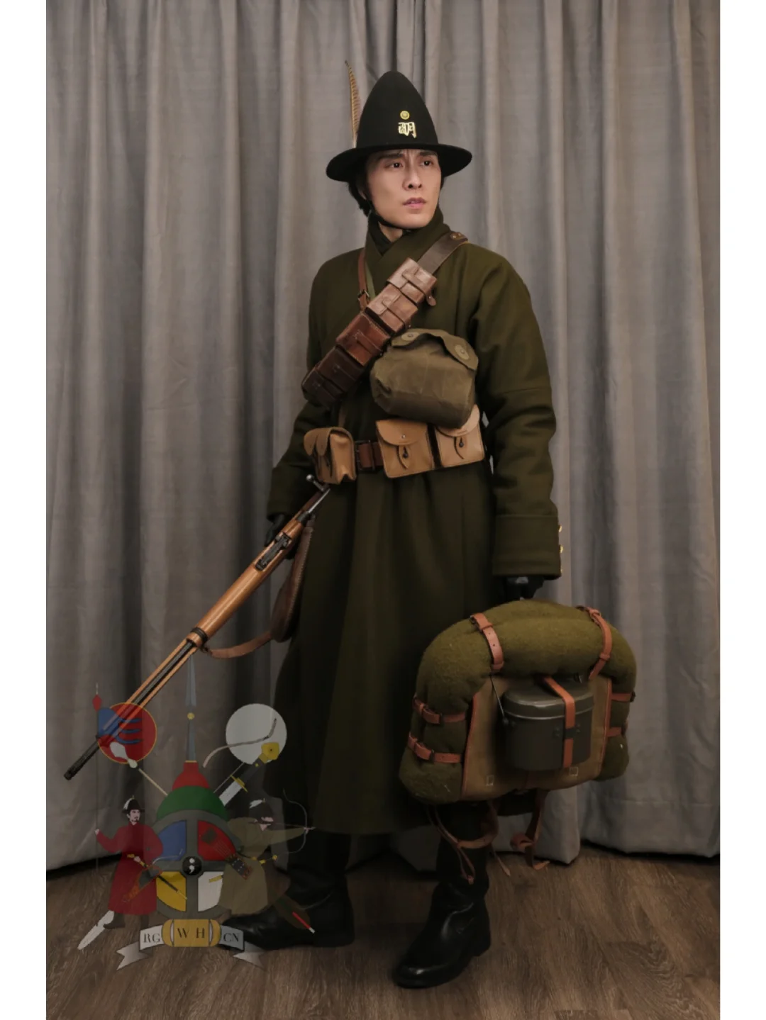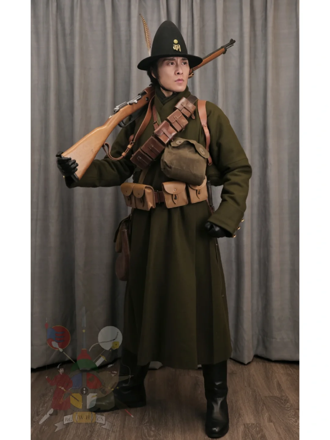 (采用传统曳撒形制的毛呢军大衣,舍弃了旧式戎服鲜艳的红蓝等配色而采用了伪装度较好的暗绿色。大衣仍为交领,侧面由铜扣固定,腰部有带袢可用于固定束带或武装带。增设了额外的口袋可收纳各类小物。)
