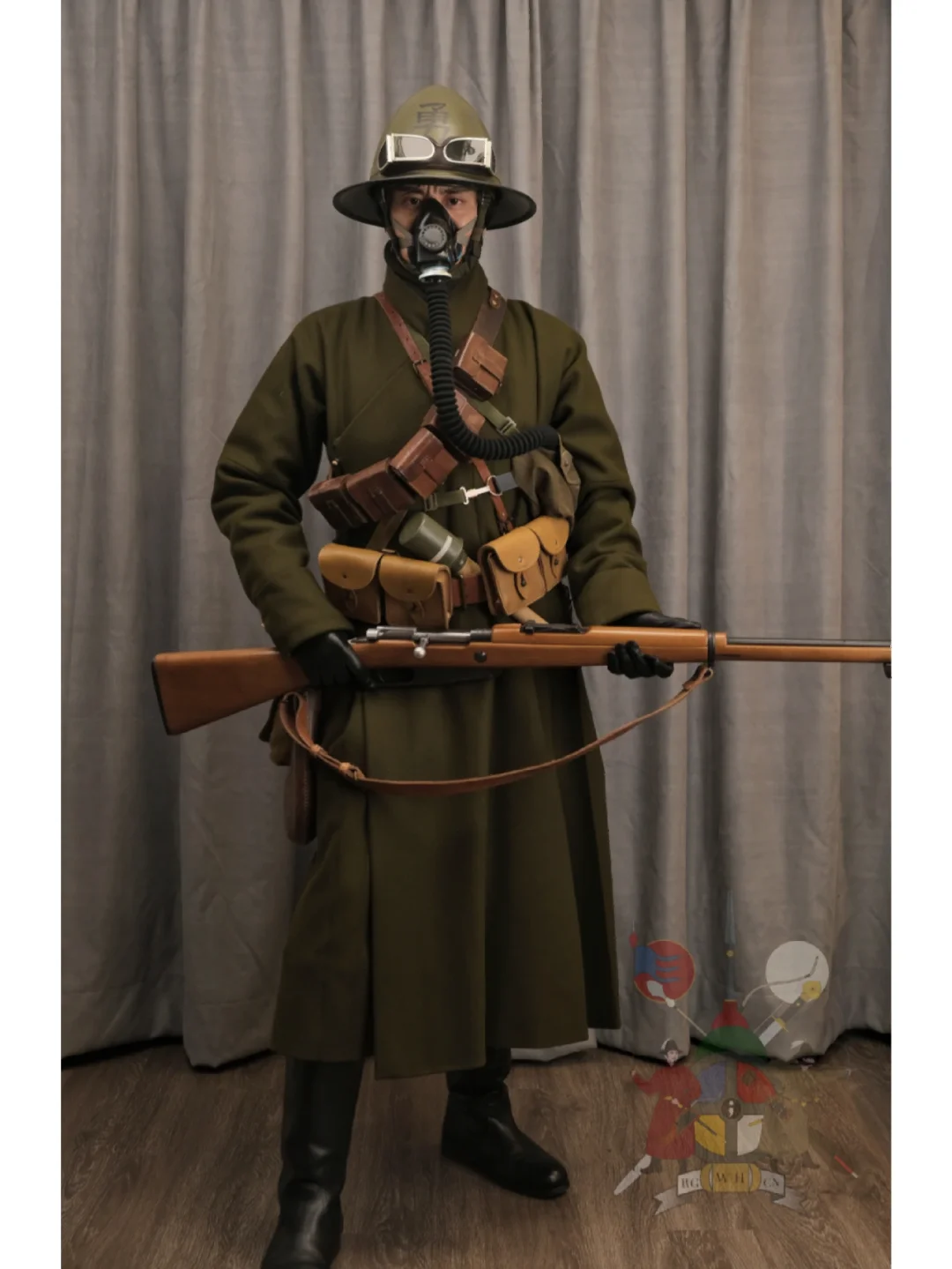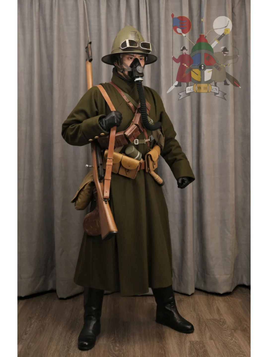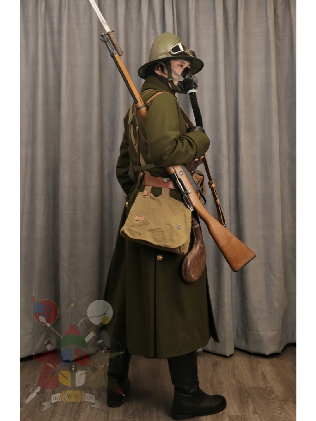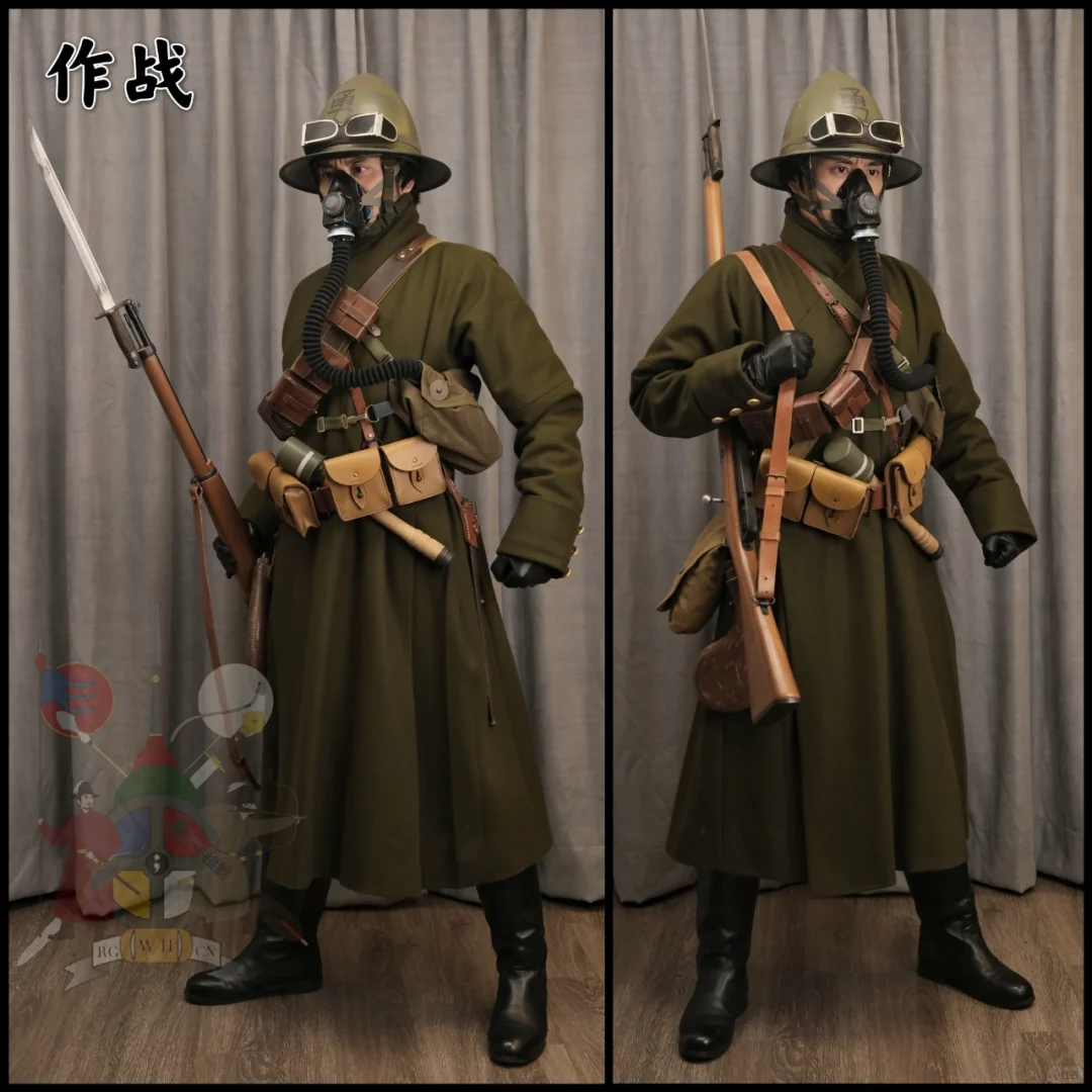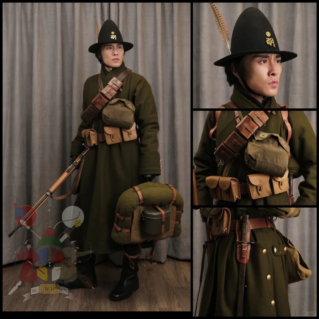 (采用传统曳撒形制的毛呢军大衣,舍弃了旧式戎服鲜艳的红蓝等配色而采用了伪装度较好的暗绿色。大衣仍为交领,侧面由铜扣固定,腰部有带袢可用于固定束带或武装带。增设了额外的口袋可收纳各类小物。)