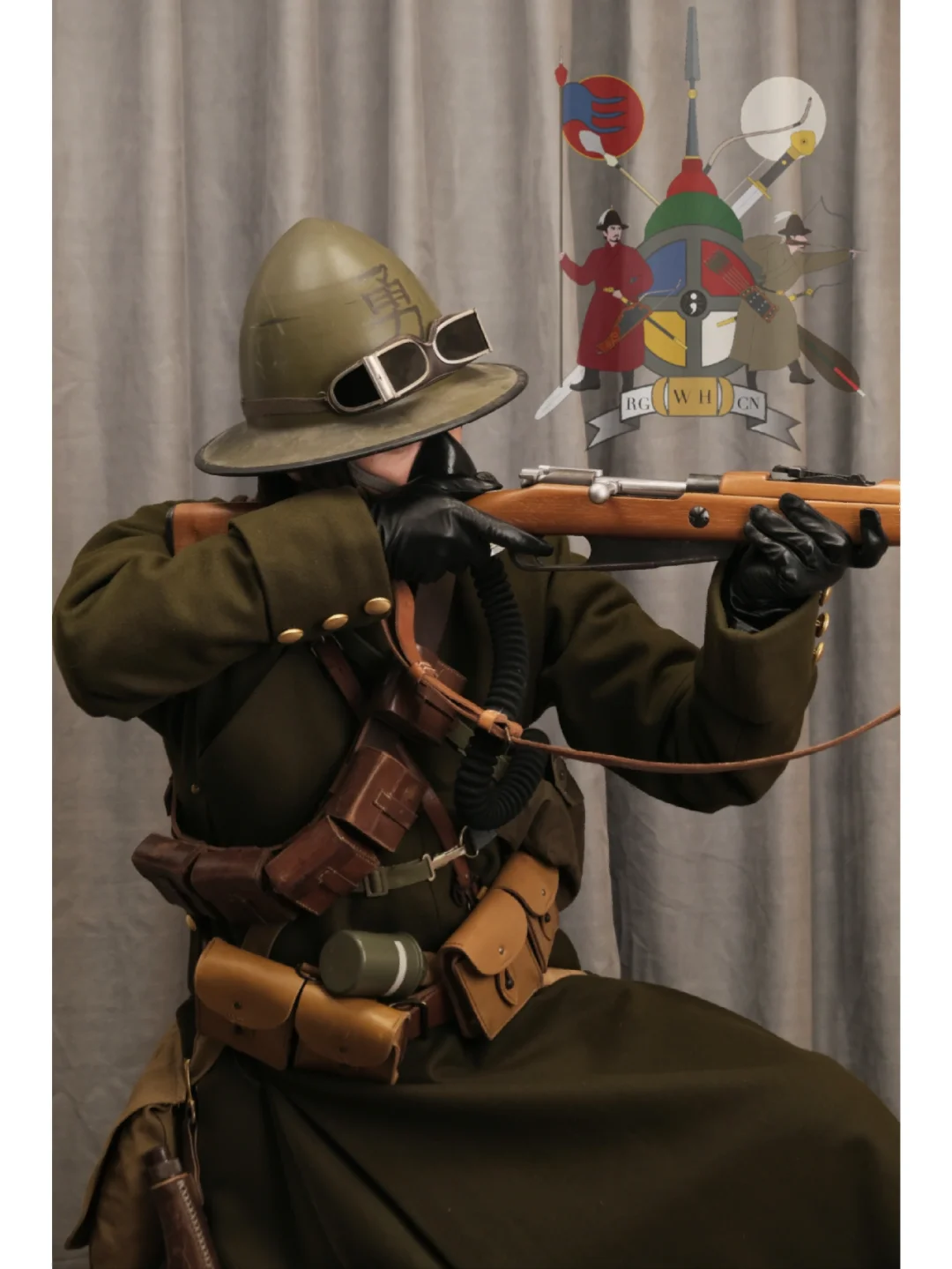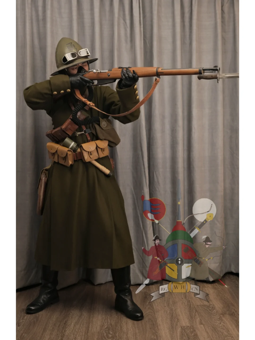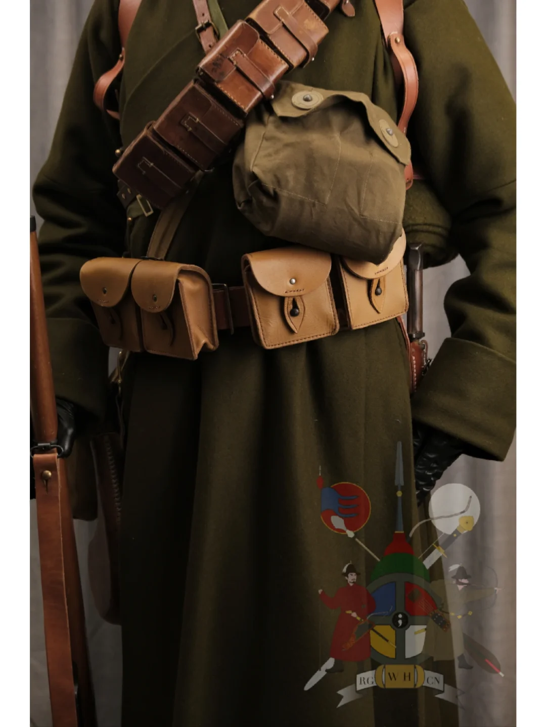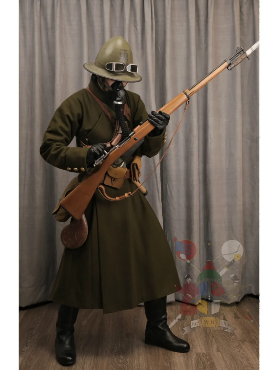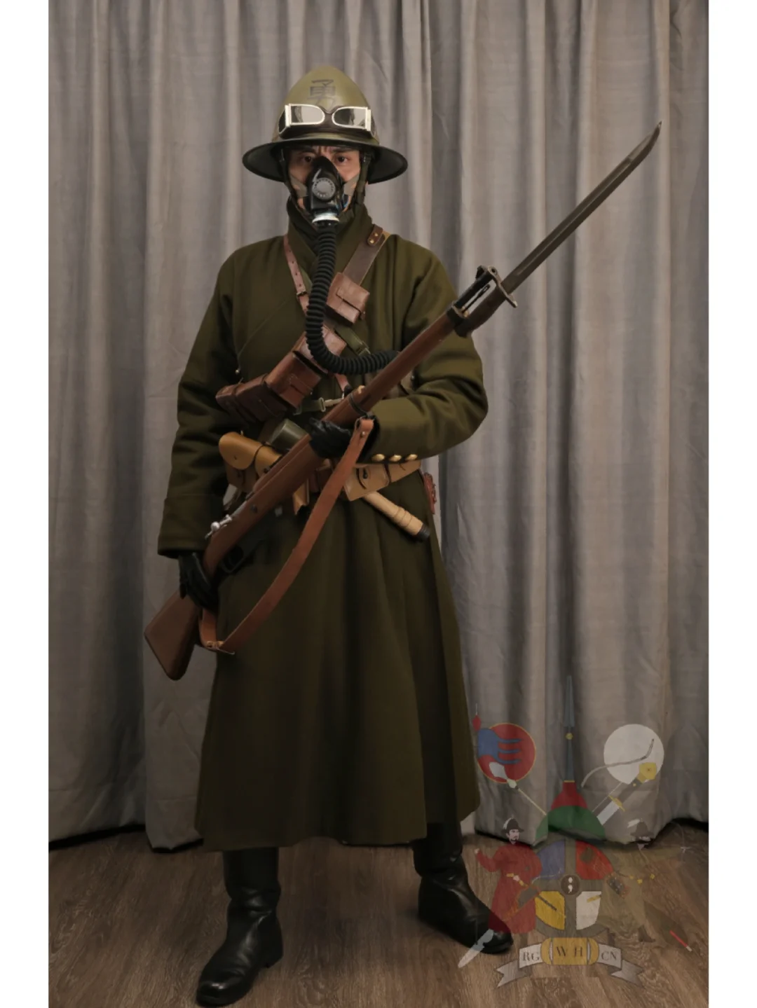 (采用传统曳撒形制的毛呢军大衣,舍弃了旧式戎服鲜艳的红蓝等配色而采用了伪装度较好的暗绿色。大衣仍为交领,侧面由铜扣固定,腰部有带袢可用于固定束带或武装带。增设了额外的口袋可收纳各类小物。)