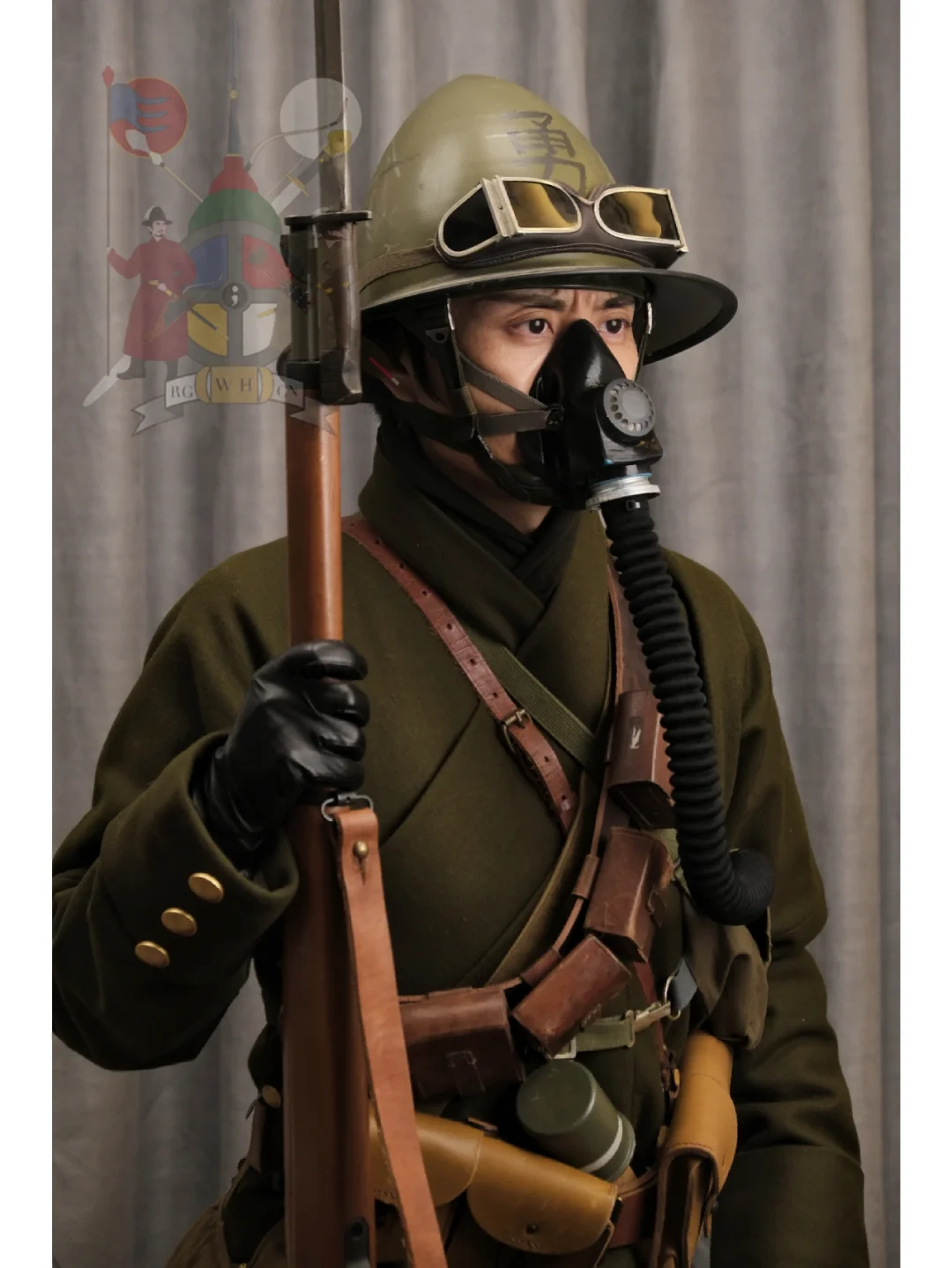 (传统笠盔造型的量产型冲压钢盔,暗绿伪装色涂装,头盔正面用黑漆书有“勇”字,宽大的盔檐可有效防御诸如空爆弹弹片,流弹等伤害,从而提高士兵的生存率。)