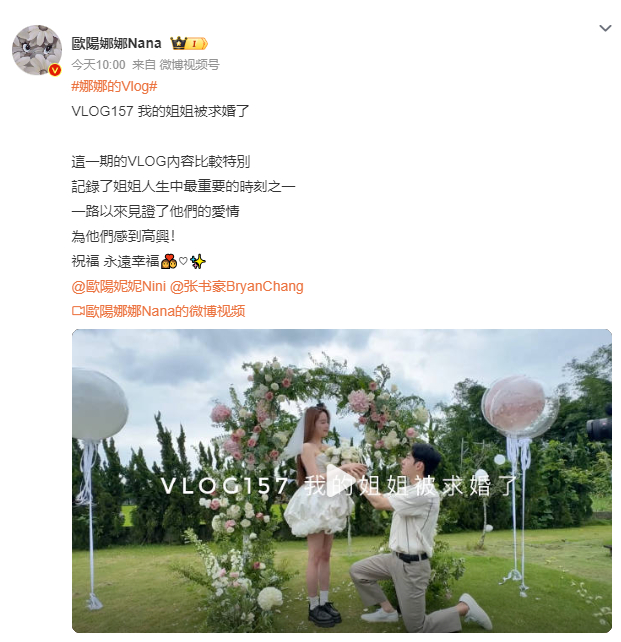 #欧阳妮妮被求婚# 欧阳娜娜分享姐姐欧阳妮妮被张书豪求婚的vlog!