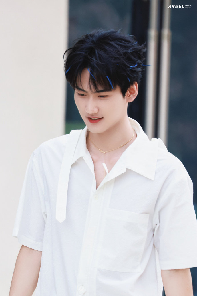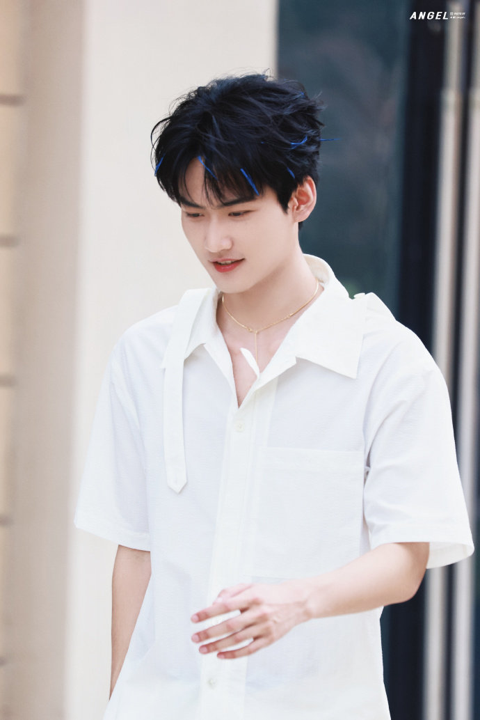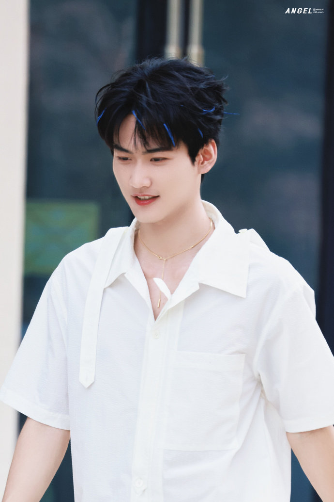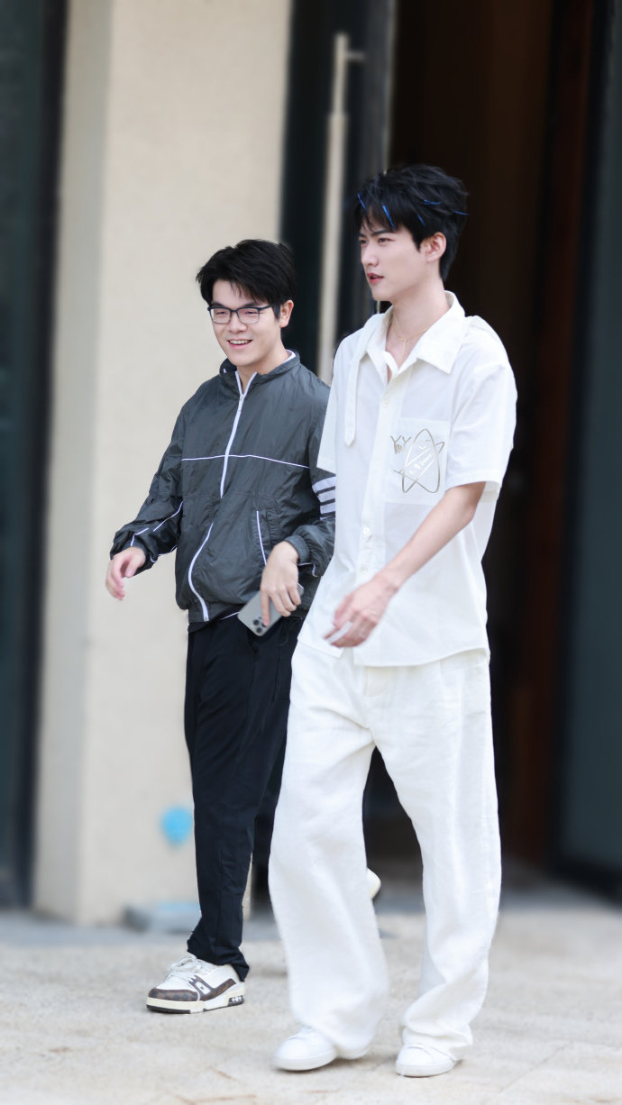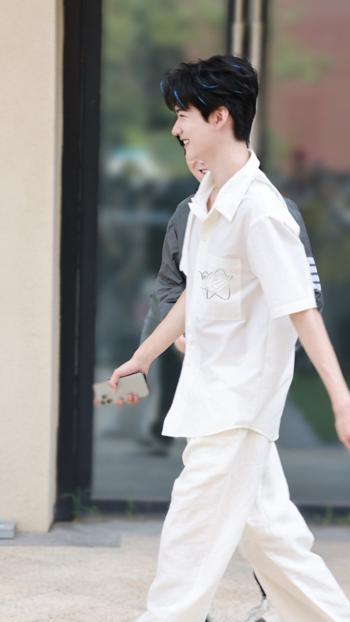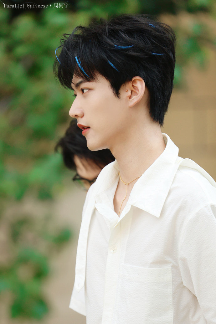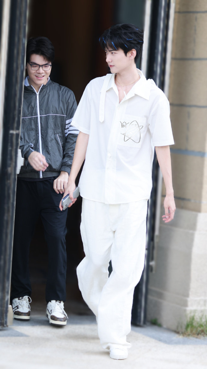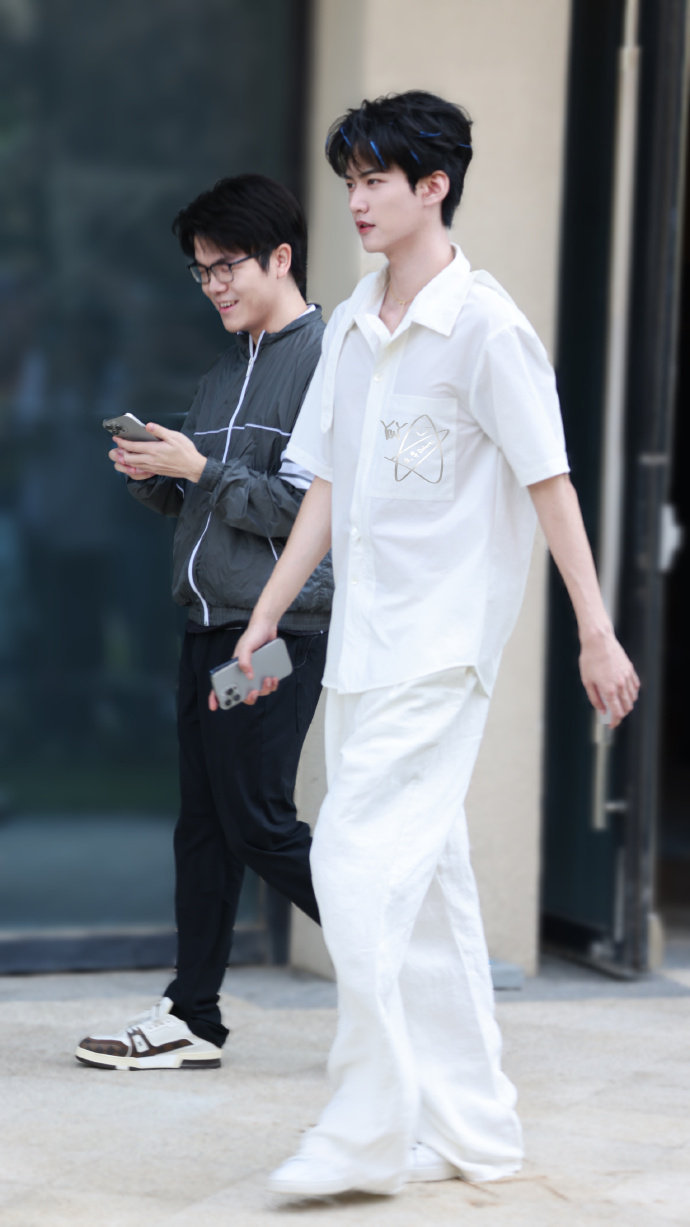 周柯宇《#战至巅峰#》上班路透全白造型+蓝色挑染真的好帅哇!录制顺利[打ca