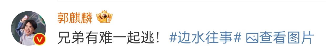 #张艺兴和郭麒麟一起挨打##张艺兴追边水往事也上头了# 张艺兴发文为郭麒麟王迅《边水往事》宣传打call!就是说《边水往事》真的谁看谁上头啊[awsl] 艺兴还cue了郭麒麟跟自己去年一样挨打,郭麒麟:兄弟有难一起逃!真的好有梗[哈哈]谁还没看《边水往事》我都会伤心的!