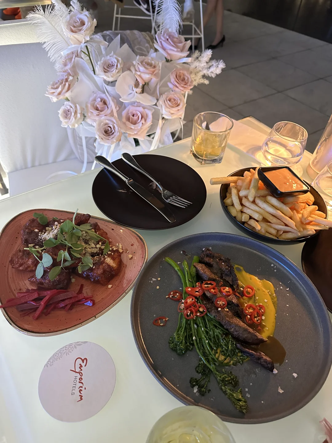 收到了花花!是开心惊喜的一天🥹作为拖延症的我,一直说要来这家露天bar,直到现在才来! - 来了以后真的很惊喜,环境很不错,吃的也不错,力推这个牛肉!大家都快去点!!全名我忘记了…薯条🍟也是必点滴,非常脆哦!炸鸡🍗太柴了不建议点…我们后面还点了个抹茶芝士蛋糕,不推荐,有点难吃[汗颜R] - 我们在里面吃完饭就坐到外面露台喝酒拍照📷咯。看着布村的夜景🌃,和朋友一起喝酒,吹吹风聊天真的很舒服😌。这种惬意的生活也就只有开学前三周能感受到了[捂脸R]。 - 📍店名:Emporium Hotel South Bank(顶楼bar) 📍地址:267 Grey St, South Brisbane QLD 4101 - ⚠️周六日去的时候大家记得要提前预约哦!人还是挺多滴,不预约就只能站着等别的桌走了🥲