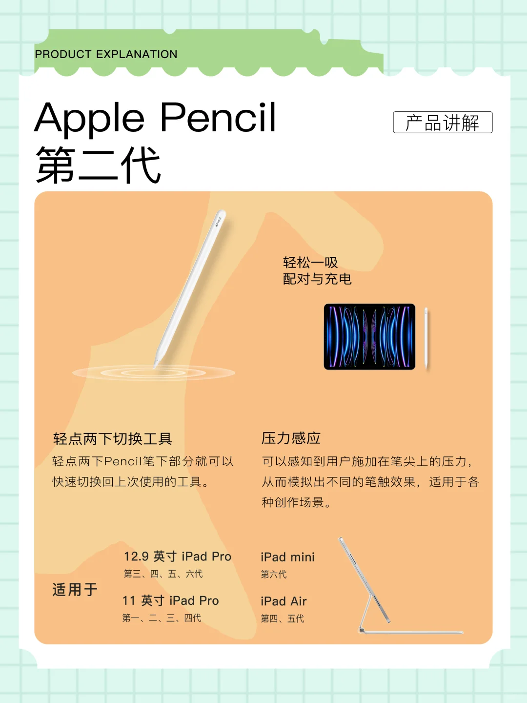 兼容性:12.9英寸iPad Pro(第三、四、五、六代)、11英寸iPad Pro(第一、二、三、四代)、iPad Air(第四、五代)、iPad mini(第六代)