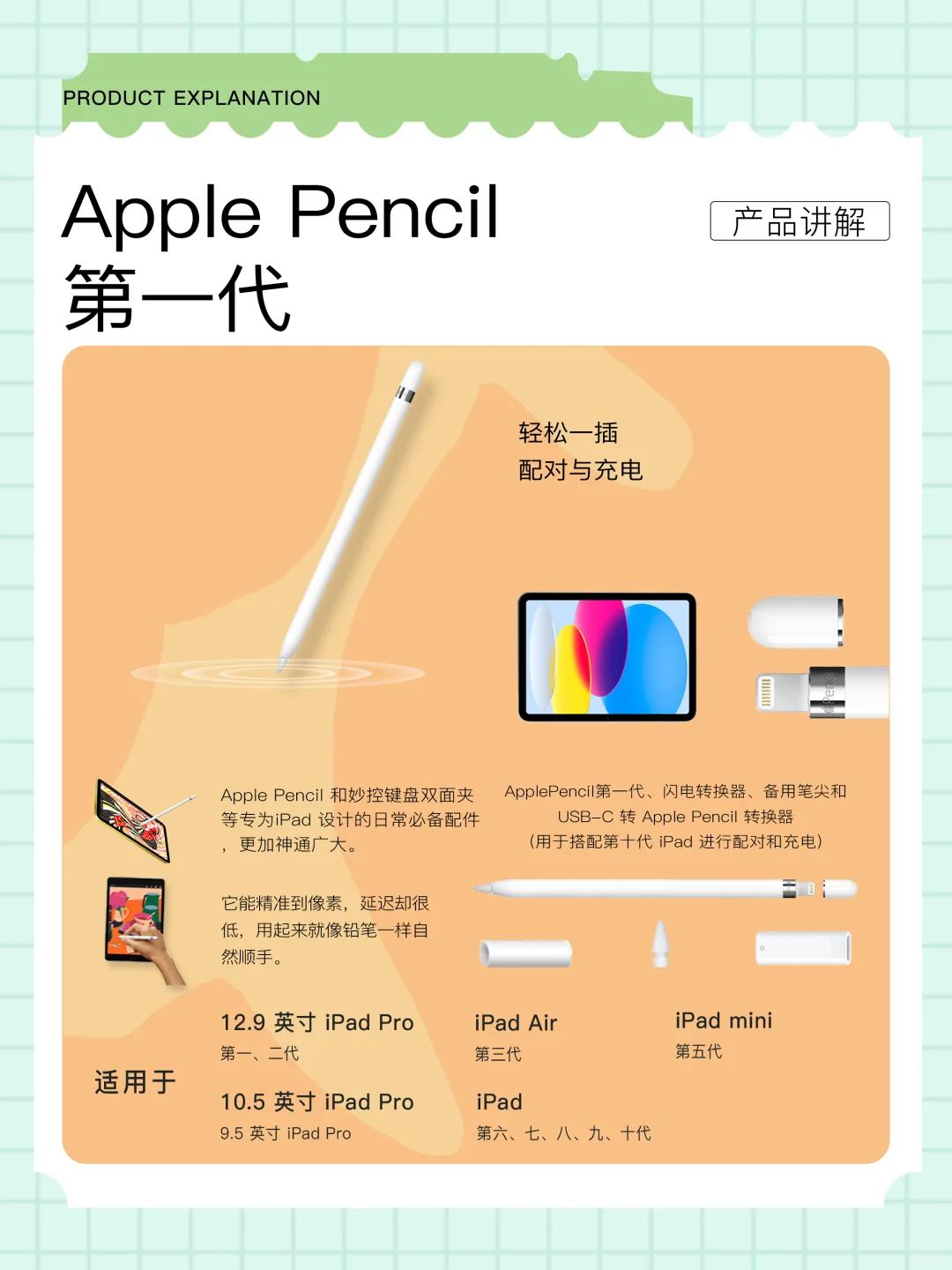 兼容性: 12.9英寸iPad Pro(第一、二代)、10.5英寸iPad Pro、9.7英寸iPad Pro、iPad Air(第三代)、iPad(第六、七、八、九、十代)iPad mini(第五代)