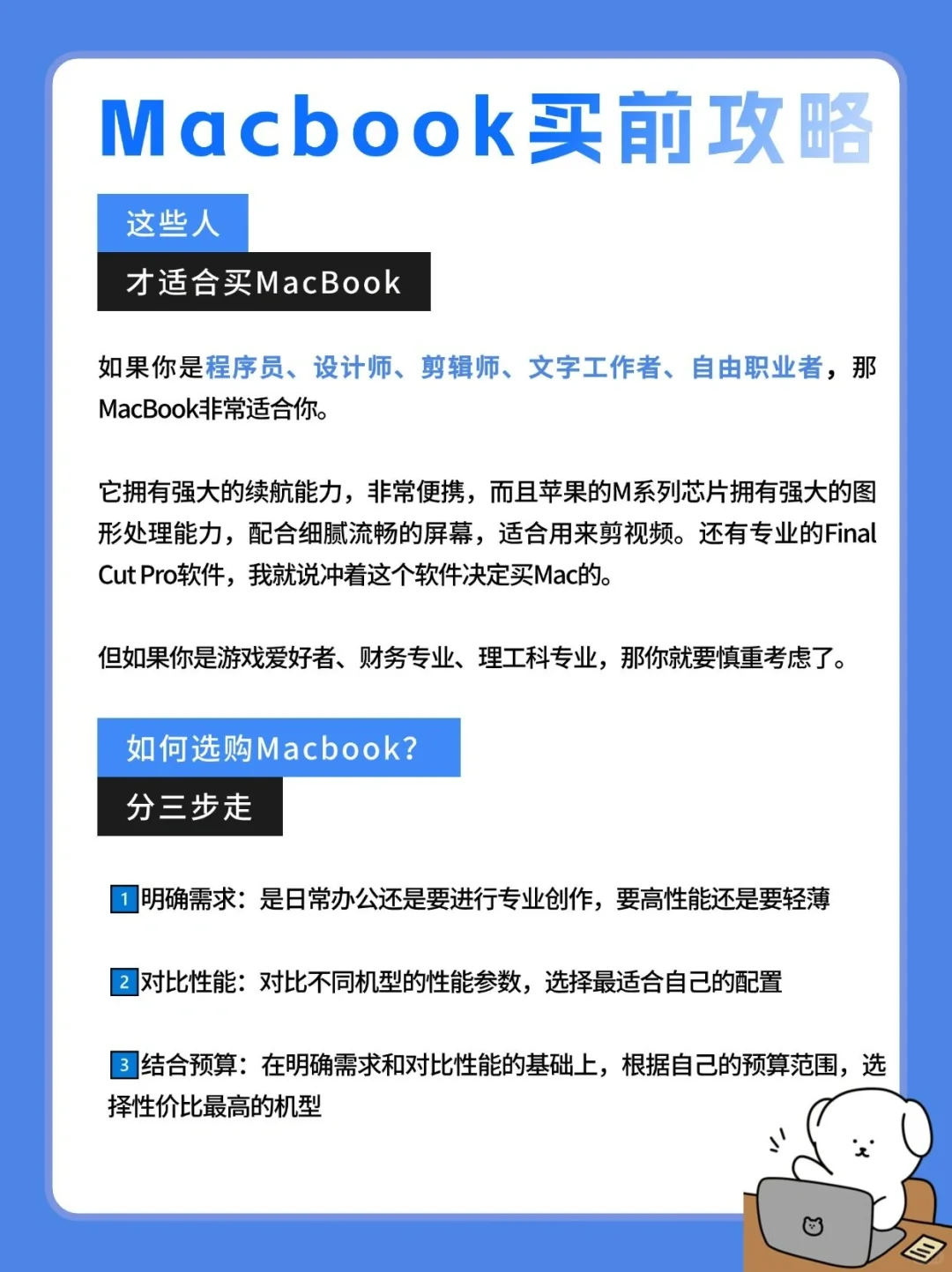 Mac分Air和Pro系列,前者适合轻便办公,后者配置更高,是专业生产力