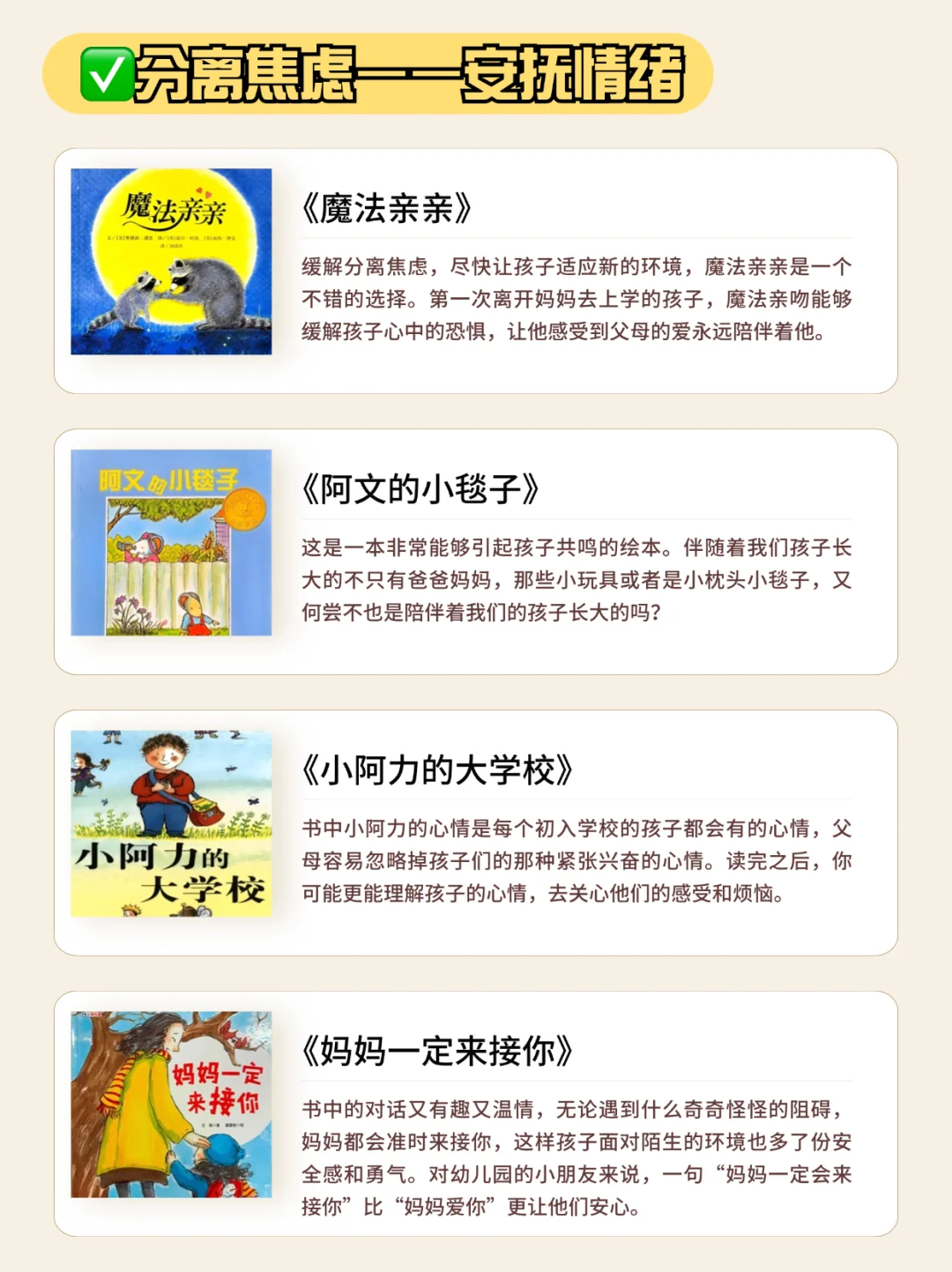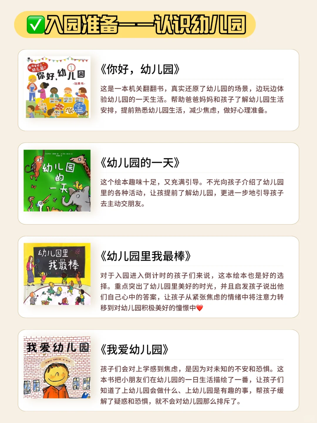 除了物品方面,还可以通过绘本提前让孩子🧒了解幼儿园生活,做好心理准备,缓解分离焦虑,平稳度过入园初期,爱上幼儿园❤️