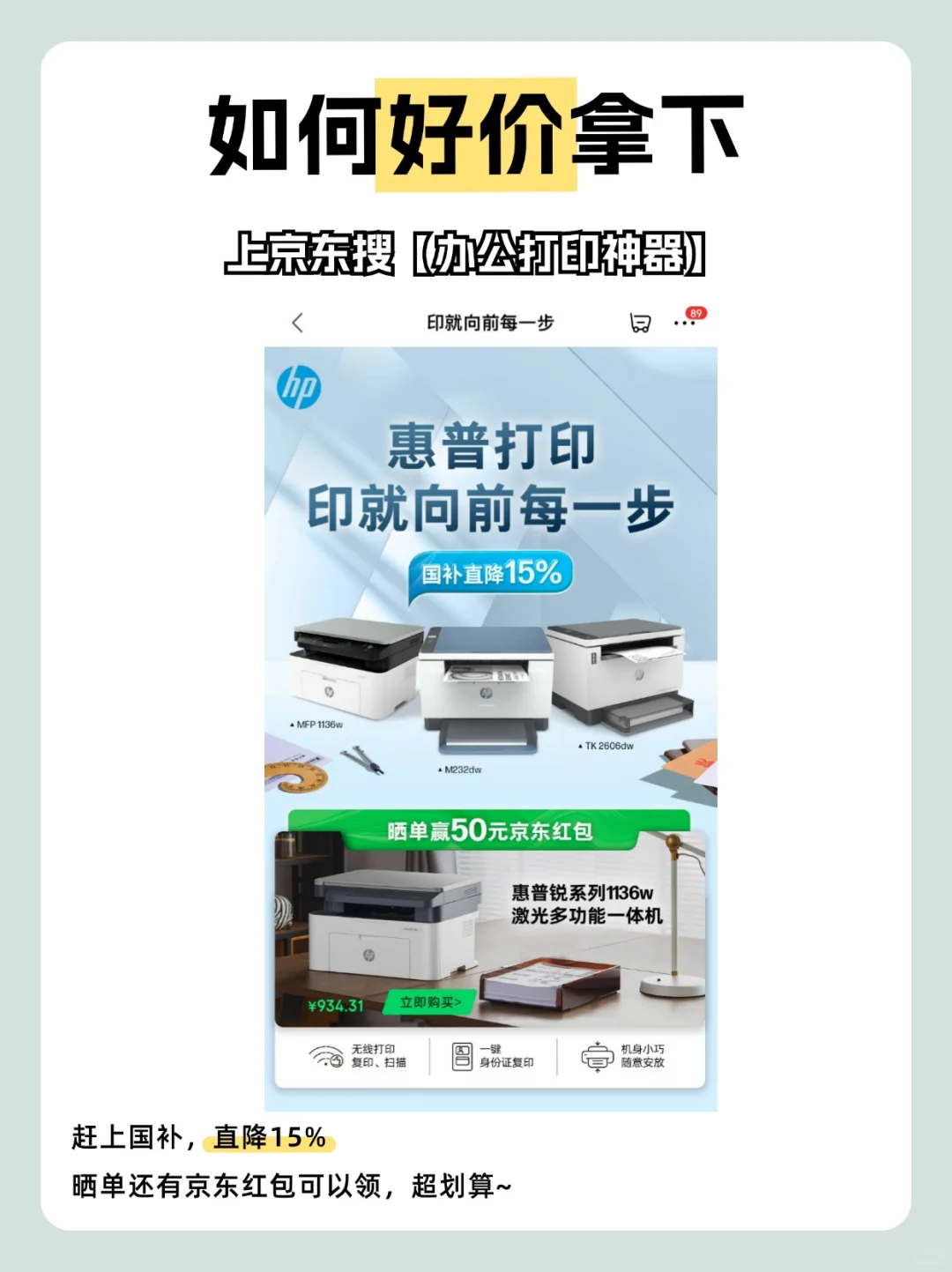 考公考研的宝子们,你们是不是要经常打印真题、资料,找网上的店打等待时间太长了,不及时;出门找打印店,学习时间少了半小时,而且打印一张就1r,真的不敢打太多。😅 讲真,自己家里有个打印机挺方便的,想什么时候打就什么时候打,成本很低,就算打很多页的pdf也不心疼。对于考公和考研党来说,打印文字的概率会更高,激光打印机很适合他们。🧡🧡🧡 👉👉收好这份激光打印机选购指南。 1.看类型:打印文字多的考公考研党优选激光 2.看功能多样性:是否支持打印、复印、扫描 3.看连接打印方式,看是否支持手机无线连接打印 4.看打印速度 5.看操作面板 6.看可以打印的介质丰富性 7.看耗材成本 👉这款惠普1136w激光打印机强推给所用考公er!经典品质,全能扛打! 👉它集打印、复印、扫描多功能于一体,非常全能,操作简单,机身紧凑小巧,放在书桌不占地,可以随意摆放,考公考研党的书桌真的不能少了这个! 打印速度高达20多页/分钟,打印再多资料也无需久等。 👉它有多种连接方式,手机电脑都能连,下载HP SmartAPP,就能手机无线连接 直接打印手机里的资料,非常方便。 而且文档输出质量很高,文字清晰锐利,表格也不模糊。 🧡各种真题卷子,一打一大摞,能立马开始刷题,咔咔提分。考公考研路上有它助力,学习更高效。 现在赶上国补,直降15%,上京东搜索【办公打印神器】直达活动页面,晒单还有京东红包可以领。 ✅️激光打印机选惠普,赶紧入手吧,祝大家早日上岸!