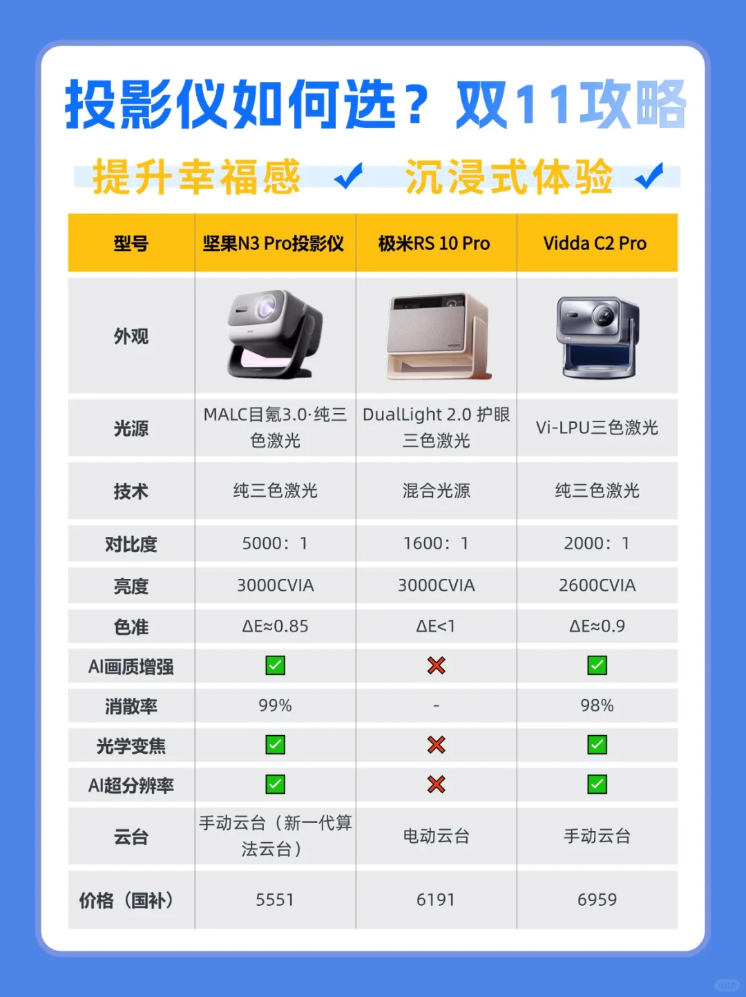 总的来说,三款投影仪各有千秋,作为敢在双11档前发行的坚果N3 Pro各方面表现突出,在拥有超清画质的同时,对于空间的要求更加宽松,且一体式的算法云台调节角度更大,画面更稳定,整体的质价比相当高,如果双11想要一台高端投影仪,入手坚果N3 Pro绝对不亏!