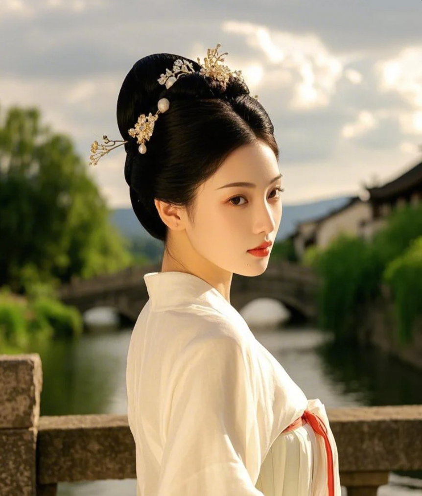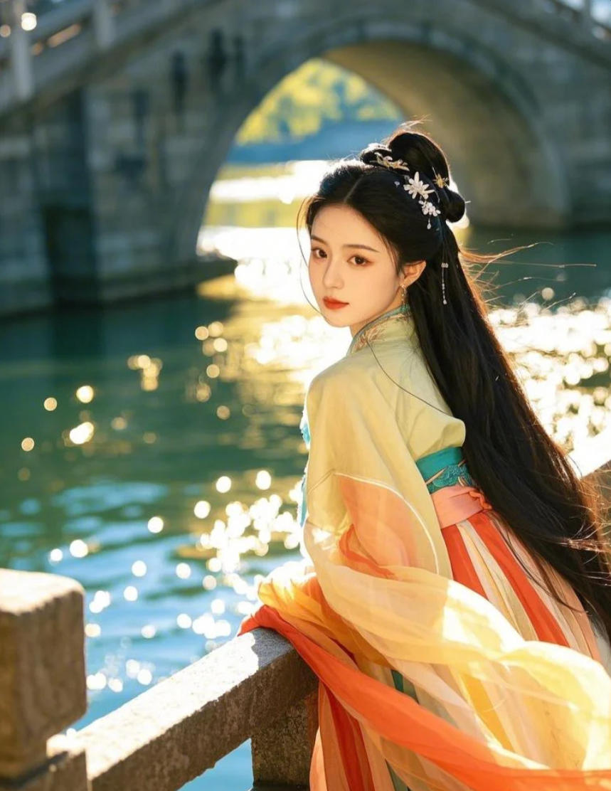 "古桥之处,小姐姐的雅致身姿令人心动"