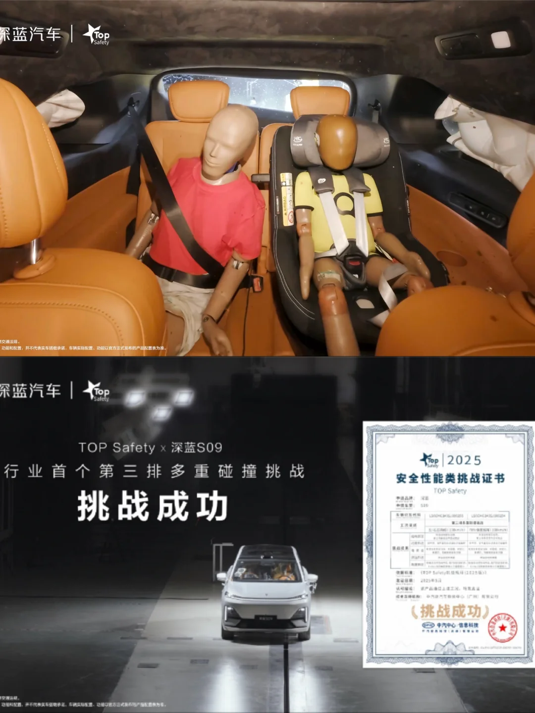 当了妈才知道,每次踩刹车时都要回头确认第三排的娃是否撞到小脑袋。那些被我们塞满老人、儿童座椅和书包的"临时座位",原来藏着全家最脆弱的安全盲区。 直到刷到深蓝S09被三辆工程车连环暴击的测试视频——100码追尾+左右夹击,尾部撞击能量是美标的1.56倍。可测试结束后,从视频里看到燃油系统无泄漏、座椅与车身结构未分离,未发生翻折电池包零起火爆炸、车门自动解锁且双闪及时开启、E-CALL紧急救援秒级响应。说实话,这哪是汽车安全测试?分明是给全家上的生命保险课。 现在终于敢理直气壮说:老人孩子都坐三排。后来回家去官网查资料发现,深蓝用十三横五纵的金刚车身,把传统"宠物专座"改造成"生命立方舱"。1080Mpa后防撞梁硬过装甲车,碰撞后车门把手自动弹开的速度比家长解安全扣还快。特别是紧急救援系统秒级响应,像给全家配了24小时云端保镖。 此外,深蓝S09用8气囊矩阵织成防护网,1500MPa热成型钢构建三级缓冲带,连假人都要在一二三排全副武装。中汽中心专家都说:这标准不是达标,是碾压! 现在终于明白:安全感不是选择题,而是必答题。当行业还在讨论安全冗余,深蓝已经给每个座位装上防弹衣——毕竟孩子的笑声,才是做妈妈最关心的。