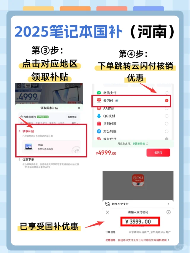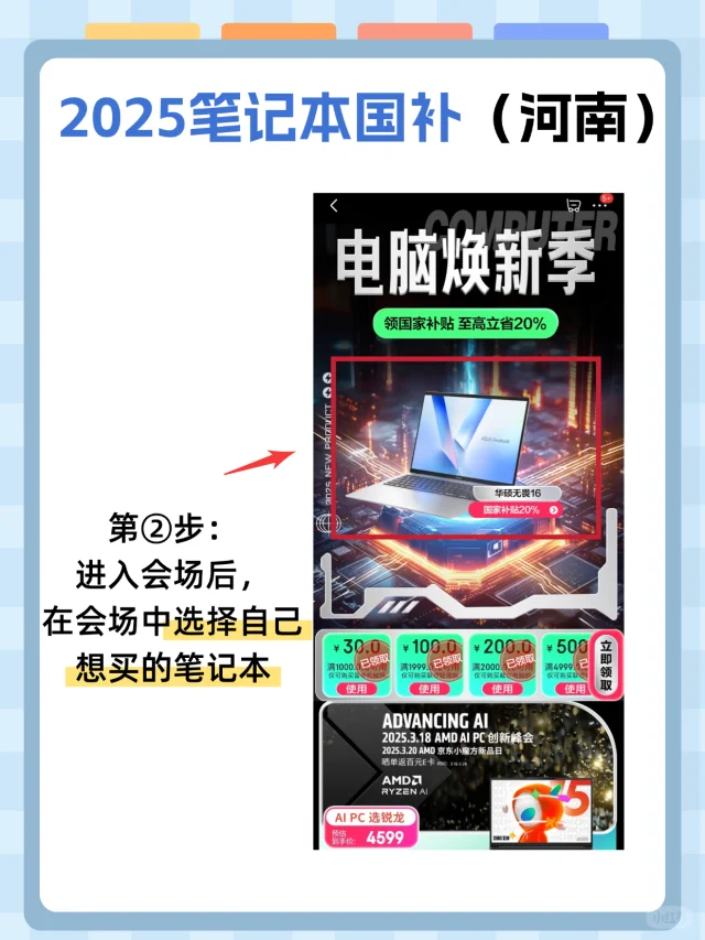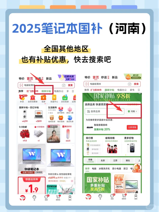 🔥目前这几款笔记本都可以参与2025年最新的国补政策,参与国补的方法法场简单,在京东🔍【电脑新品666】即可进入会场。在会场中选择自己想买的笔记本,然后去定位河南地区领取补贴,下单勾选云闪付即可核销优惠~