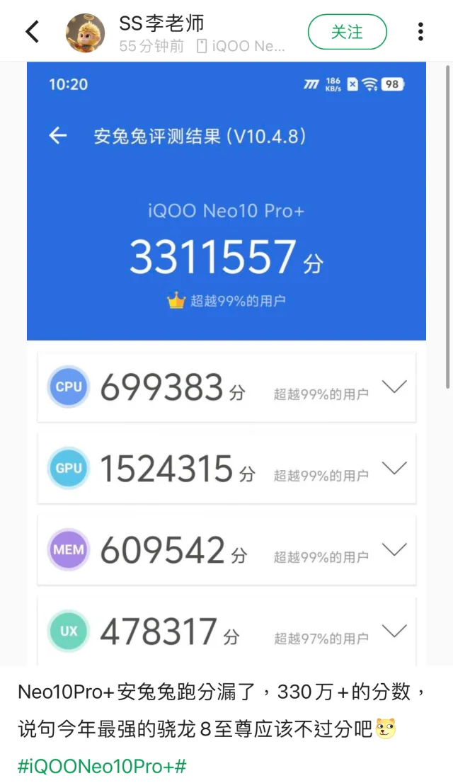 搭载了骁龙8至尊版处理器+独显芯片,安兔兔跑分可以高达331万,可以说是目前跑分最高的骁龙8至尊版手机了,不得不说骁龙调教还是得看iQOO啊。