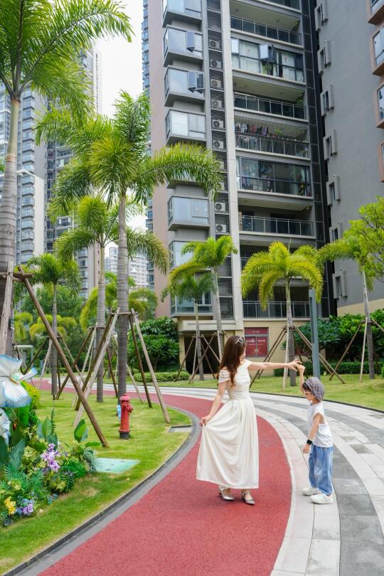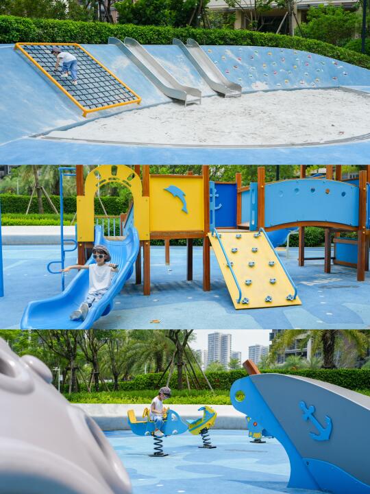 里面还有各种配套设施:儿童乐园、游泳池、跑道、健身房……