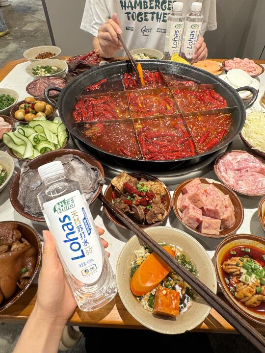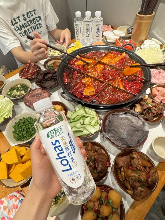 山城重庆,满街都飘着火辣的味道,堪称火锅江湖。 火锅店遍地都是~(超爱的),一天三顿都不为过。 红彤彤的牛油锅底,咕噜噜煮着各种美食 火辣锅底的浓郁香气,带来了刺激的口感,根本停不下来! 最近重庆的天气越来越热,出门就暴汗的程度,但再热也不能阻止我出门吃火锅~ 在双重热辣下,人不由得变得烦躁,火锅的热辣滚烫,不光让味蕾得到了满足 同时也对胃产生了刺激感,这时就不得不拿出我火锅必备--悦活天然苏打水 PH8.0+天然弱碱性刚刚好,入口顺滑,不会像其他苏打水那样涩口 无气无糖无香精等人工添加,不光喝着没有负担,还不会胀气打嗝儿,简直刚刚好~ 而且还是中粮出品,不光背书,有保障,还富含了碳酸氢根、偏硅酸等多种矿物质,温和有舒服,同时也拯救了我爱吃辣的胃~ 悦活天然苏打水诚不欺我!!大家放心冲!! ·