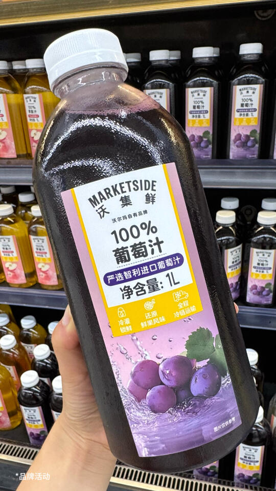 沃集鲜随手拿的!!!喝了一次就有无数次!!!真的忍不住马上囤上了!!! 太适合重庆的夏天了!!!用的都是智利葡萄🍇,酸酸甜甜,100%果汁就是空口吃葡萄的感觉!!!很清爽,很好啃😭 对了!!!一定要冰镇一下再喝,更爽,下班回家就忍不住来一杯!!!太解暑咯!!!关键还很便宜,1l大容量,才9.99r!!!真的太适合打工人了,性价比真的很ok了!!! 还有橙汁、苹果汁都很好喝哦 沃尔玛必买沃尔玛果汁推荐沃集鲜果汁适合夏天的饮料