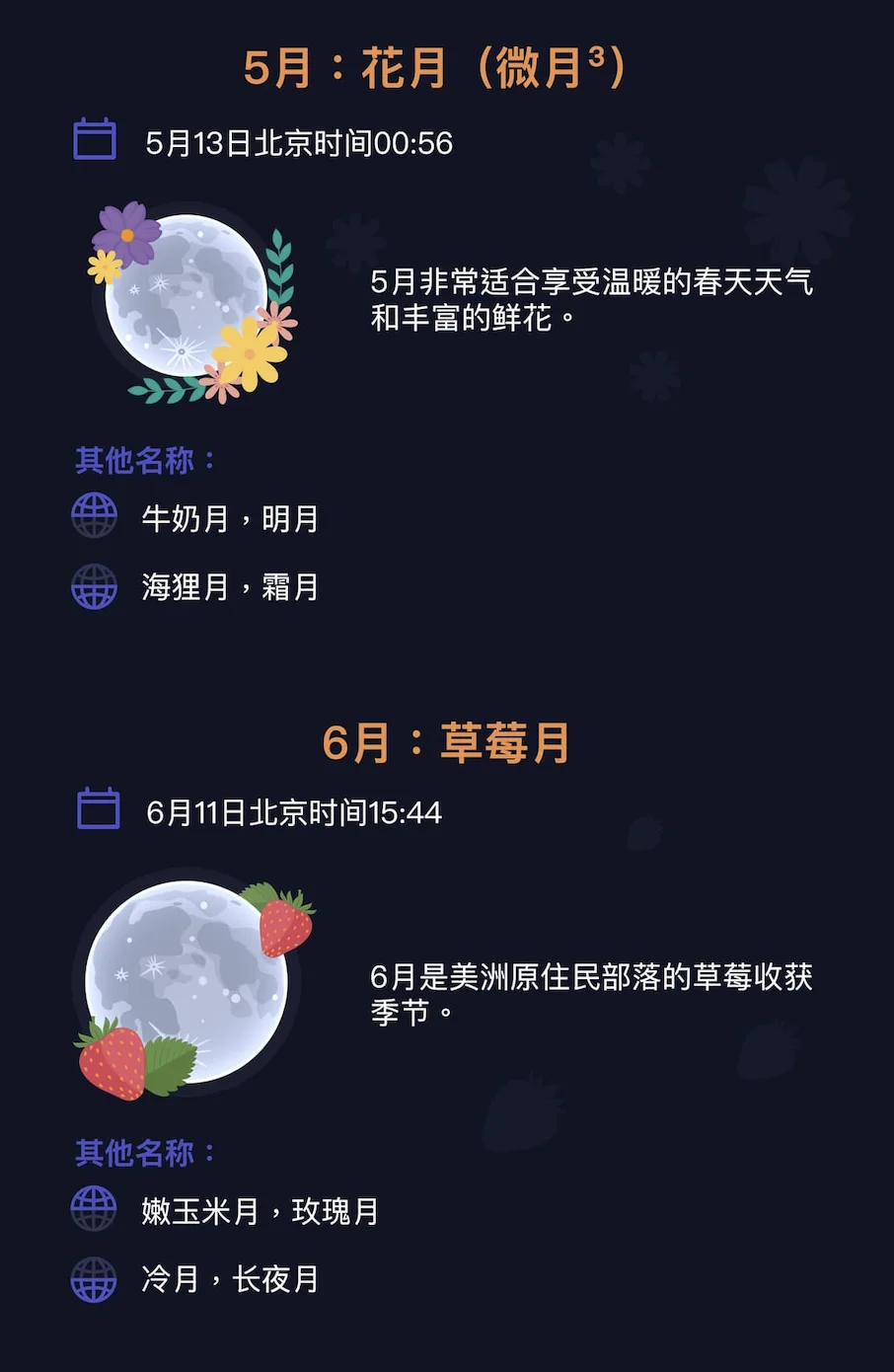 🍓“草莓月”是美洲原住民对6月满月的传统称呼之一;对他们来说,6月是草莓收获的季节。因此,这个名字不是基于月球外观的特征,而是基于月份的特征。