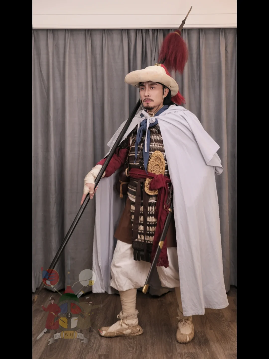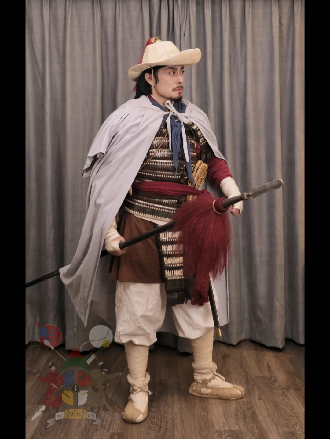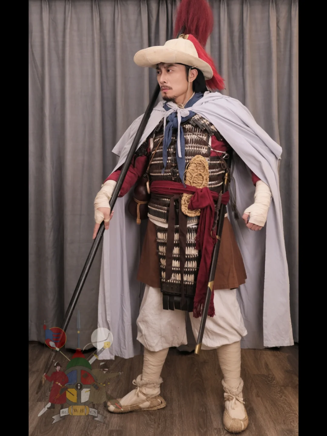 灵感来源: 《水浒传》 搭配要素一览: 衣物: *素色短褐 *围裙 *范阳笠 *腕缠(自制) *行缠步履 *披风(自制) *领巾(自制) *裹腰 (自制) *对襟短札甲 (自制) *葫芦 武器及附件: *佩刀 *长枪 摄影📷: