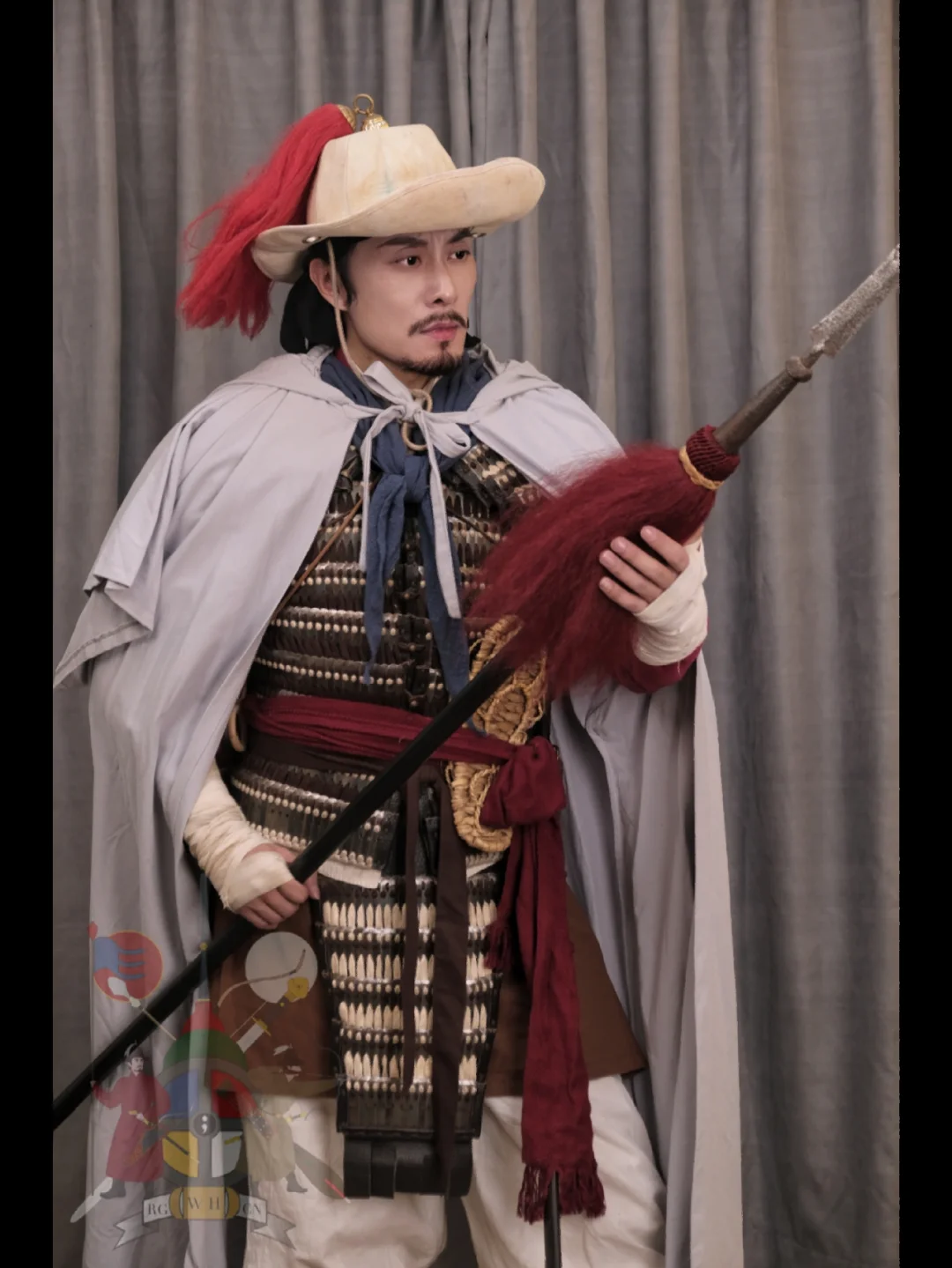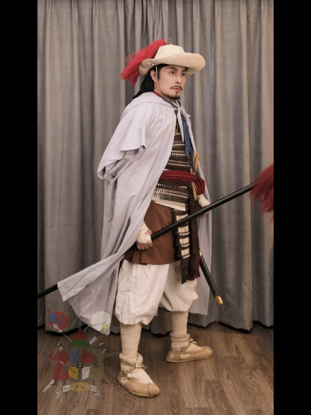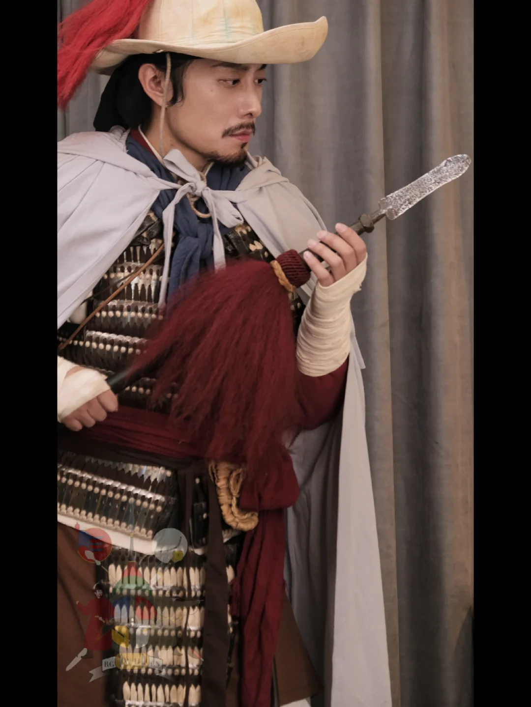 灵感来源: 《水浒传》 搭配要素一览: 衣物: *素色短褐 *围裙 *范阳笠 *腕缠(自制) *行缠步履 *披风(自制) *领巾(自制) *裹腰 (自制) *对襟短札甲 (自制) *葫芦 武器及附件: *佩刀 *长枪 摄影📷:
