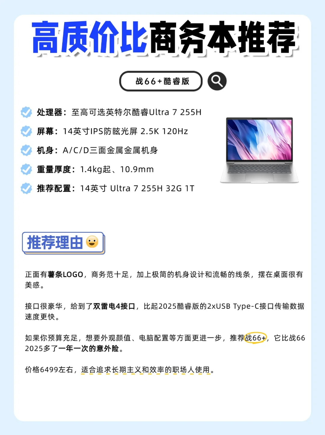 如果你预算充足,想要外观颜值、电脑配置等方面更进一步,推荐战66+,它比战66 2025多了一年一次的意外险。价格6499左右,适合追求长期主义和效率的职场人使用。