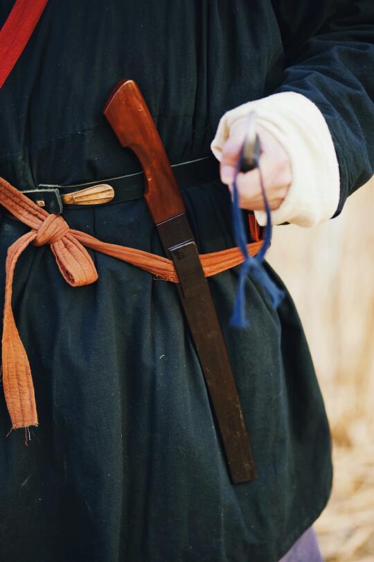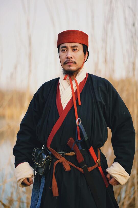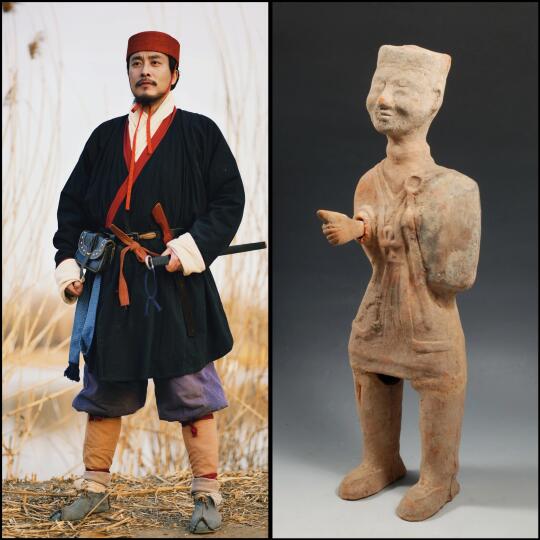 造型参考:东汉灰陶武士俑 装备:赤帻、环首刀、服刀、鞶囊等 p4~p6:服刀,在魏晋南北朝时期,服刀的设计逐渐从环首演化为刀茎与木柄的组合结构, 这种小刀功能性强,既适合日常生活中的切割需求,如切绳子、切肉、切菜,又可用于自卫防身。 造型出镜:拍摄: