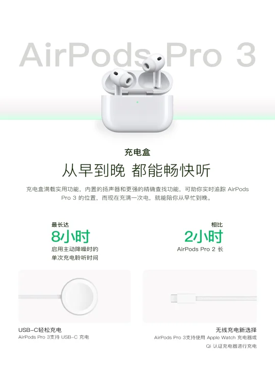 以前Pro2一天两充的痛谁懂!这款开启降噪能听8小时,比上一代多2小时,通透模式更能撑10小时!早上充满电出门,下班摸鱼追剧到回家还有电,充电5分钟就能用1小时,应急超方便。