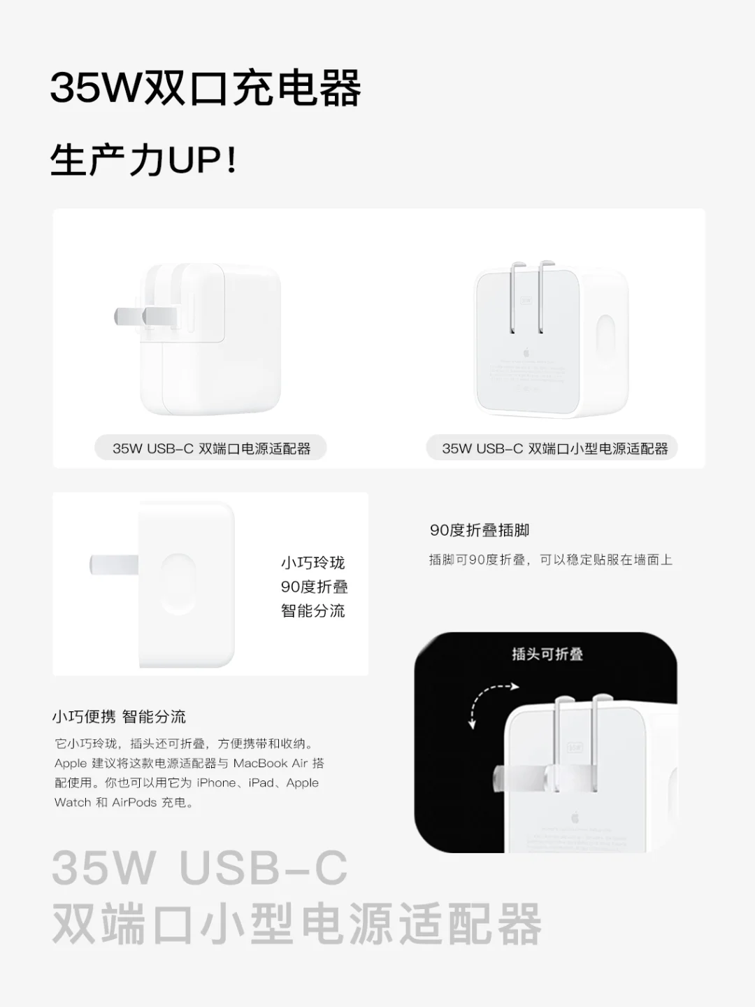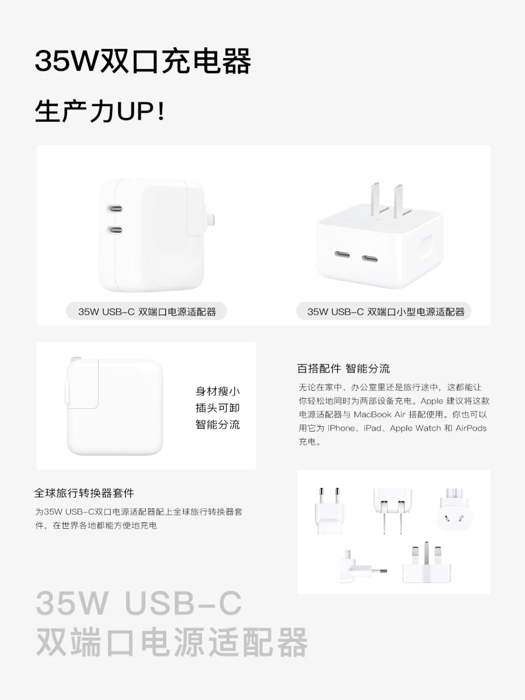 谁懂旅行时被一堆充电线缠成 “毛线球” 的崩溃?苹果 35W 双 USB-C 端口电源适配器直接解锁充电自由,配上全球旅行转换器套件,不管在哪个国家,插电就能用,再也不用带好几个充电器占行李!