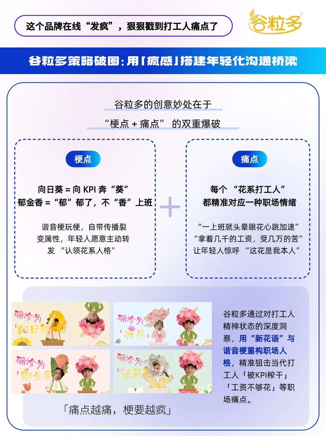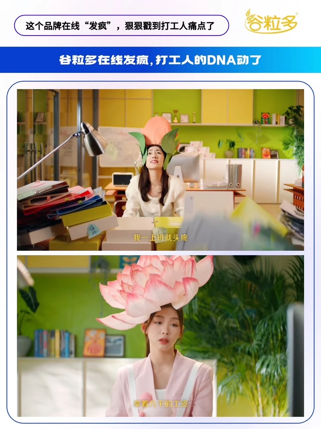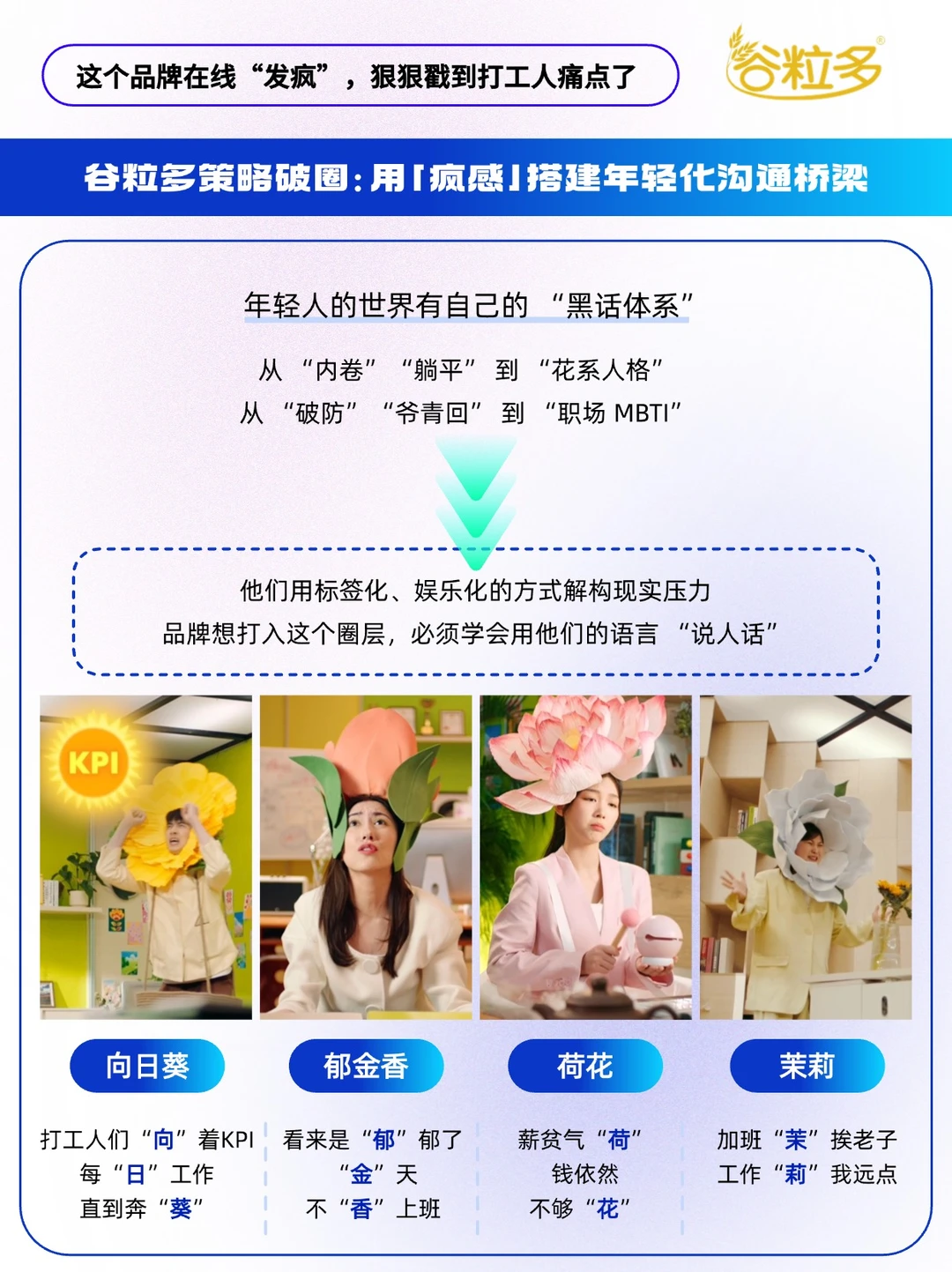 - 在这个 “注意力碎片化” 的时代 年轻化营销的核心从来不是 “我有多潮” 而是 “我有多懂你”。 近期,谷粒多联动大V“大表哥 995 ”,把镜头对准打工人的职场日常,拍摄了一支TVC,把打工人比作 “向日葵”“郁金香”“荷花”“茉莉”等花朵,用时下热梗精准戳中职场人痛点~ 「痛点越痛,梗要越疯」[得意R] 🌻向日葵: 打工人们“向”着KPI,每“日”工作,直到奔“葵” 🌷郁金香: 看来是“郁”郁了,“金”天,不“香”上班 🪷荷花: 薪贫气“荷”,钱依然不够“花” 🌸茉莉花: 加班“茉”挨老子,工作“莉”我远点 🔵谷粒多这个职场扛饿搭子,从物理层进阶到精神层,它通过对打工人精神状态的深度洞察,用“新花语”与谐音梗重构职场人格,精准狙击当代打工人「被KPI榨干」「工资不够花」等职场痛点。 当谷粒多把 “谷粒花” IP 变成打工人的情绪符号, 用户记住的不再是 “谷粒多有什么成分”, 而是“这个品牌懂我”—— 好感度的本质,是品牌成为用户精神世界的一部分。 快来艾特你的职场搭子, 认领 “打工人花系人格”[doge]