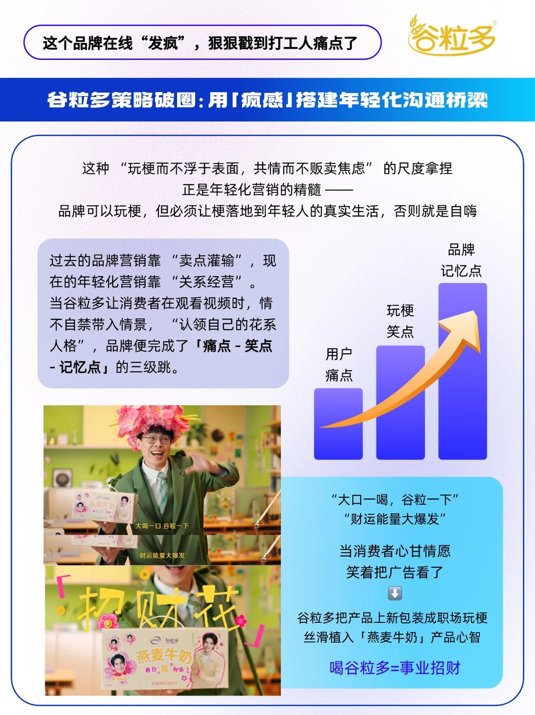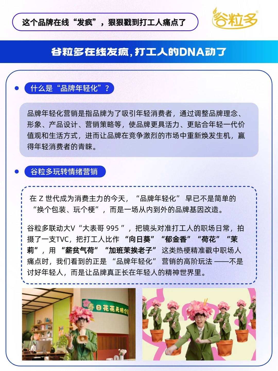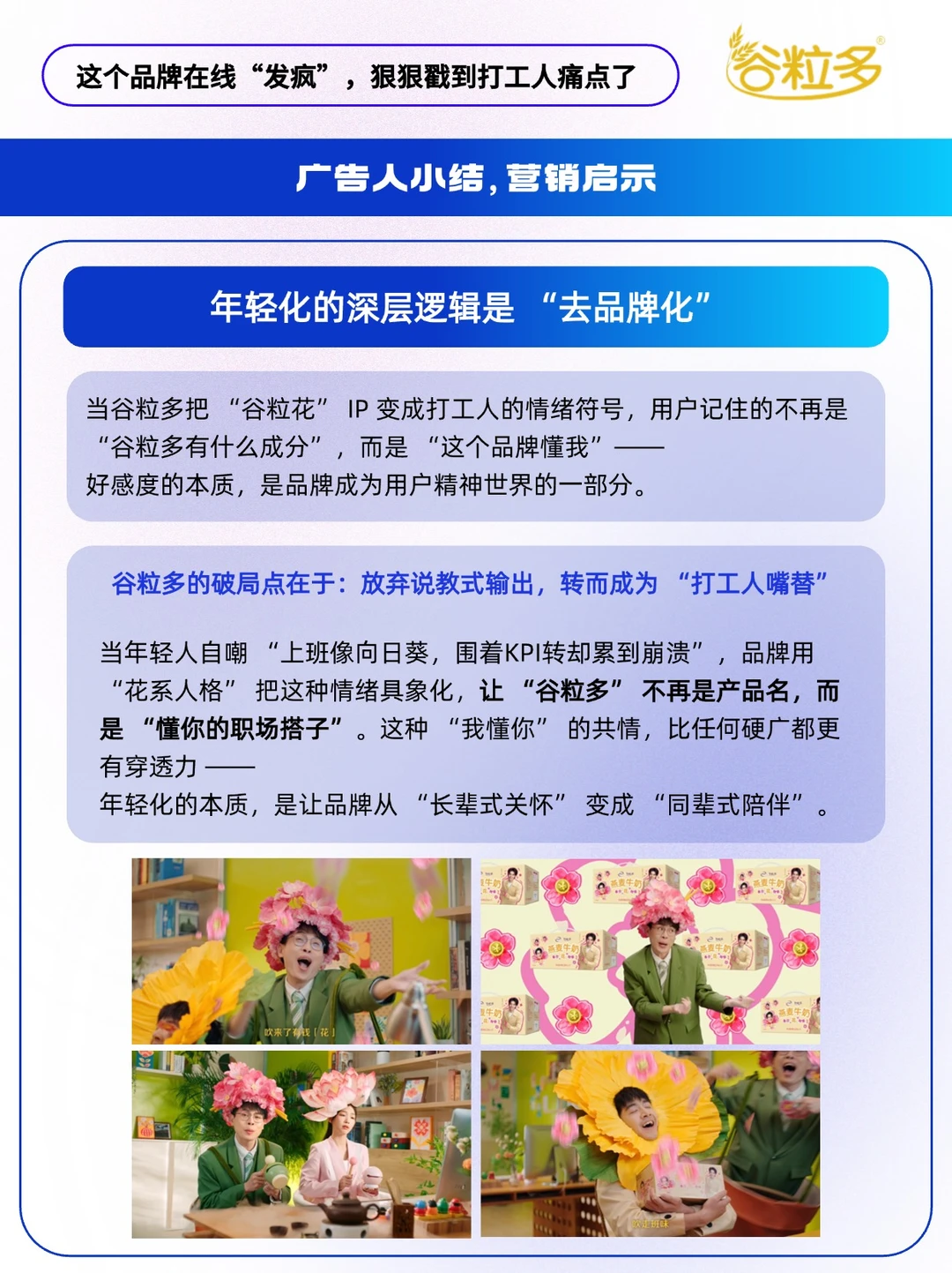 - 在这个 “注意力碎片化” 的时代 年轻化营销的核心从来不是 “我有多潮” 而是 “我有多懂你”。 近期,谷粒多联动大V“大表哥 995 ”,把镜头对准打工人的职场日常,拍摄了一支TVC,把打工人比作 “向日葵”“郁金香”“荷花”“茉莉”等花朵,用时下热梗精准戳中职场人痛点~ 「痛点越痛,梗要越疯」[得意R] 🌻向日葵: 打工人们“向”着KPI,每“日”工作,直到奔“葵” 🌷郁金香: 看来是“郁”郁了,“金”天,不“香”上班 🪷荷花: 薪贫气“荷”,钱依然不够“花” 🌸茉莉花: 加班“茉”挨老子,工作“莉”我远点 🔵谷粒多这个职场扛饿搭子,从物理层进阶到精神层,它通过对打工人精神状态的深度洞察,用“新花语”与谐音梗重构职场人格,精准狙击当代打工人「被KPI榨干」「工资不够花」等职场痛点。 当谷粒多把 “谷粒花” IP 变成打工人的情绪符号, 用户记住的不再是 “谷粒多有什么成分”, 而是“这个品牌懂我”—— 好感度的本质,是品牌成为用户精神世界的一部分。 快来艾特你的职场搭子, 认领 “打工人花系人格”[doge]