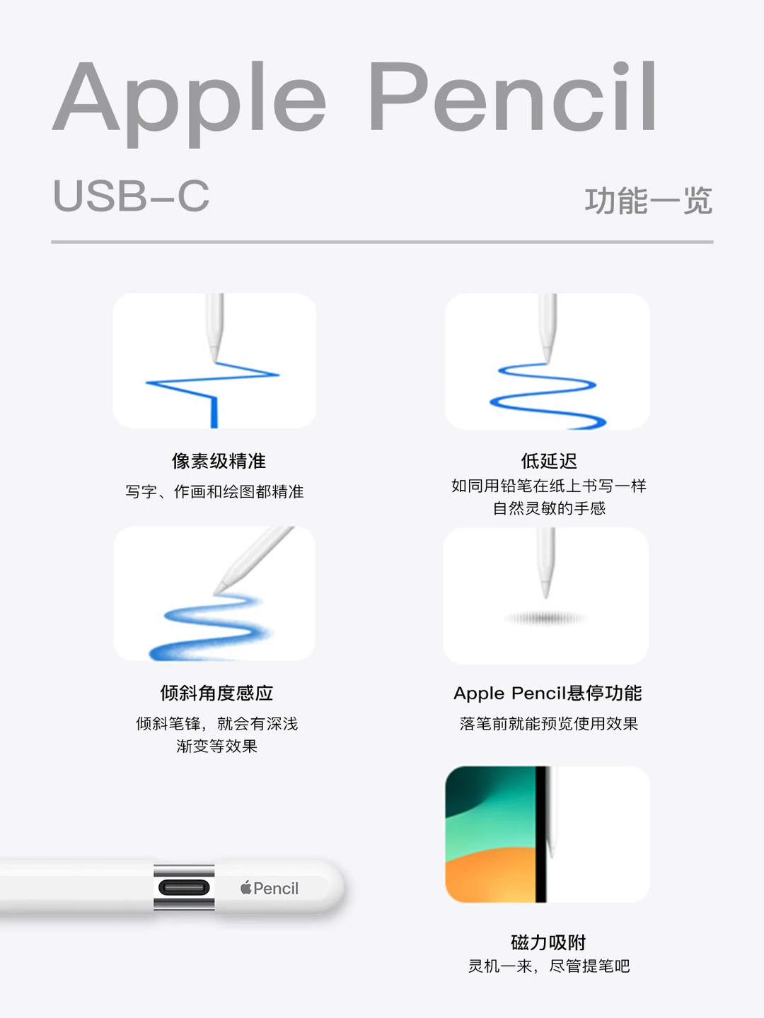 🧲 4. 磁力吸附:再也不怕丢笔帽 之前用老款笔总丢笔帽,每次找笔帽都要翻遍书包!这支USB-C版直接磁吸在iPad侧边,一吸就稳,再也不用单独找笔套收纳。 实测就算带着iPad走路颠簸,笔也不会掉下来,随手一吸超方便。充电的时候也不用拔笔帽,直接把USB-C接头插上iPad就行,再也不用担心笔帽弄丢没法充电的尴尬~