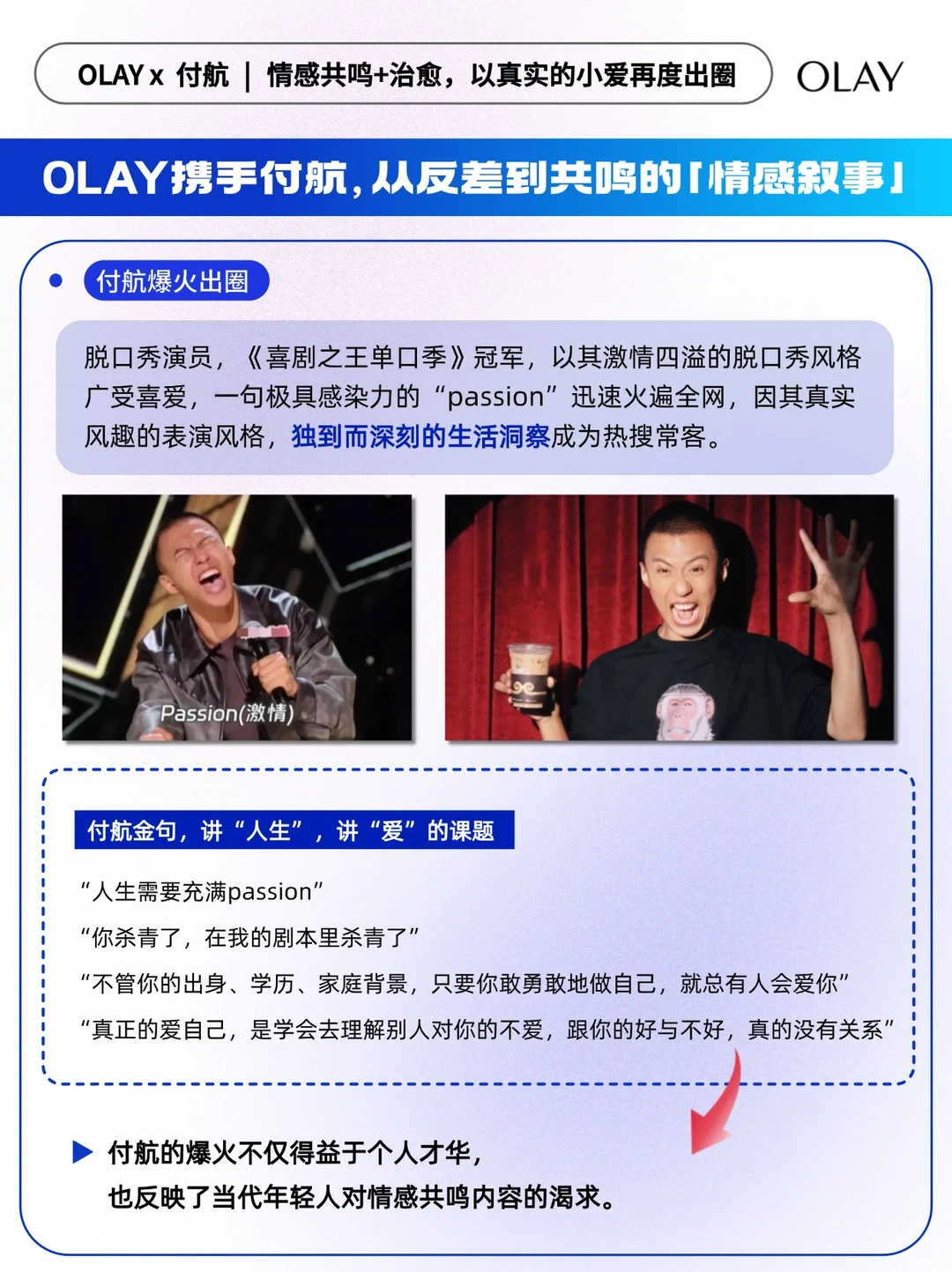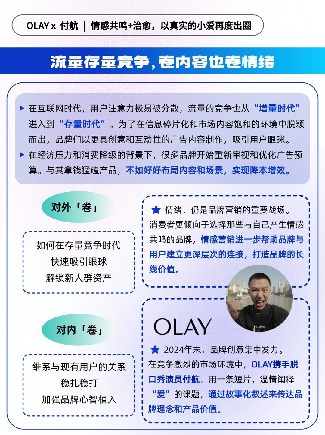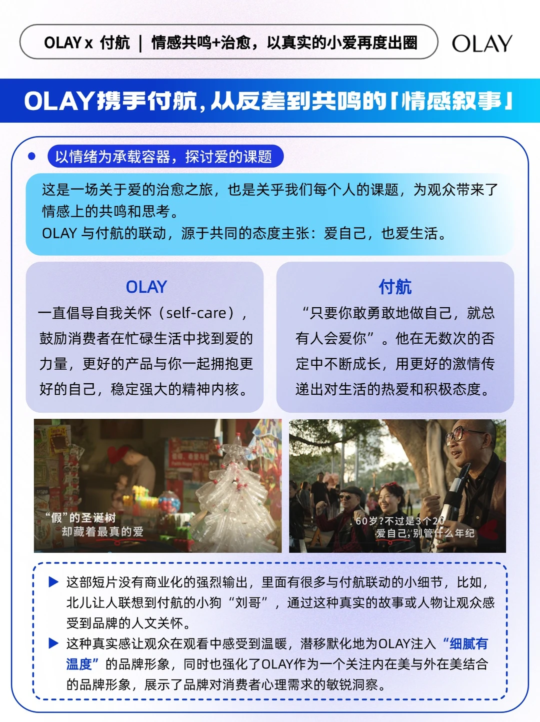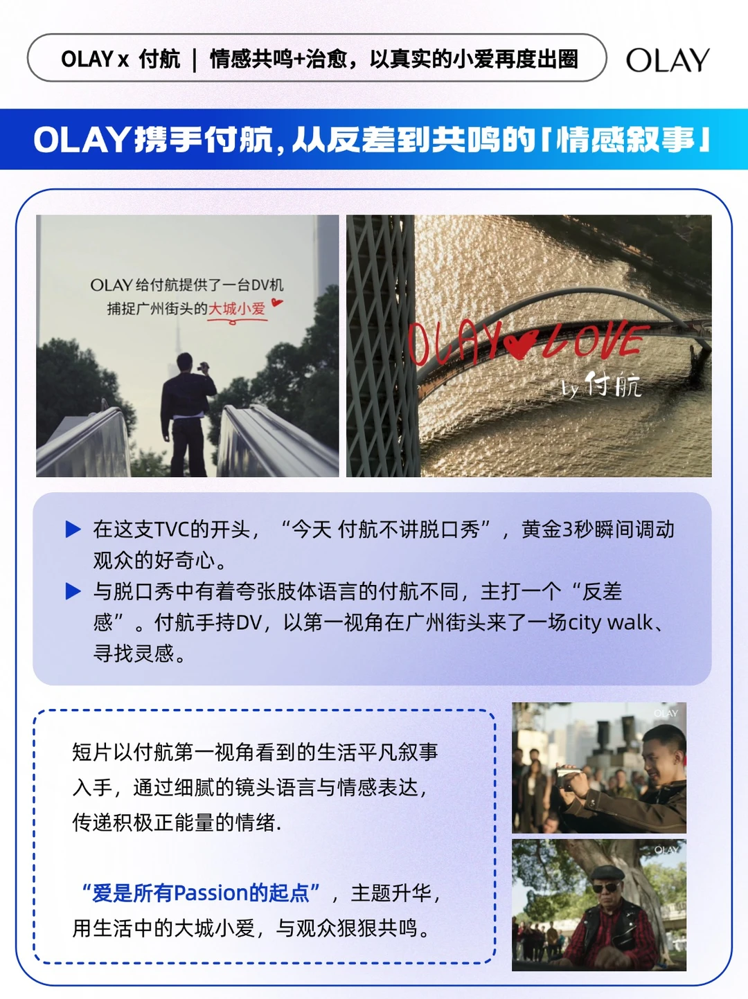 🔵OLAY携手脱口秀演员付航,用一条暖心短片,温情阐释“爱”的课题,以「治愈力」实现和用户的情感共振,通过故事化叙述来传达品牌理念和产品价值。它犹如一缕温暖的阳光,照亮了我们对爱的深刻理解。