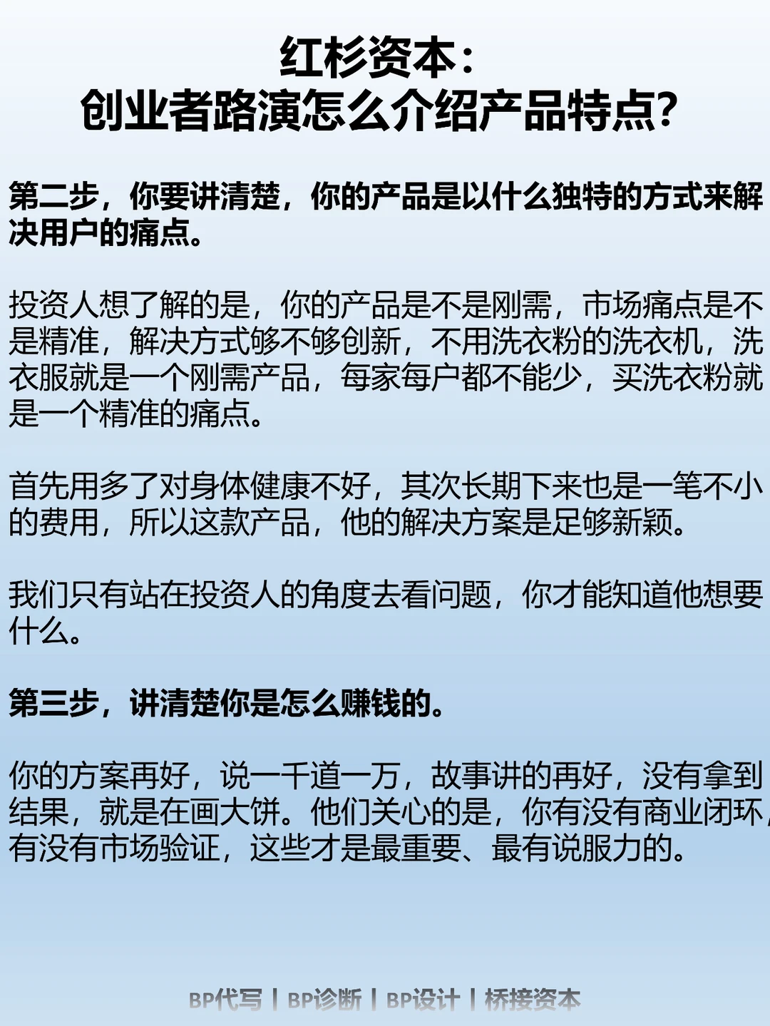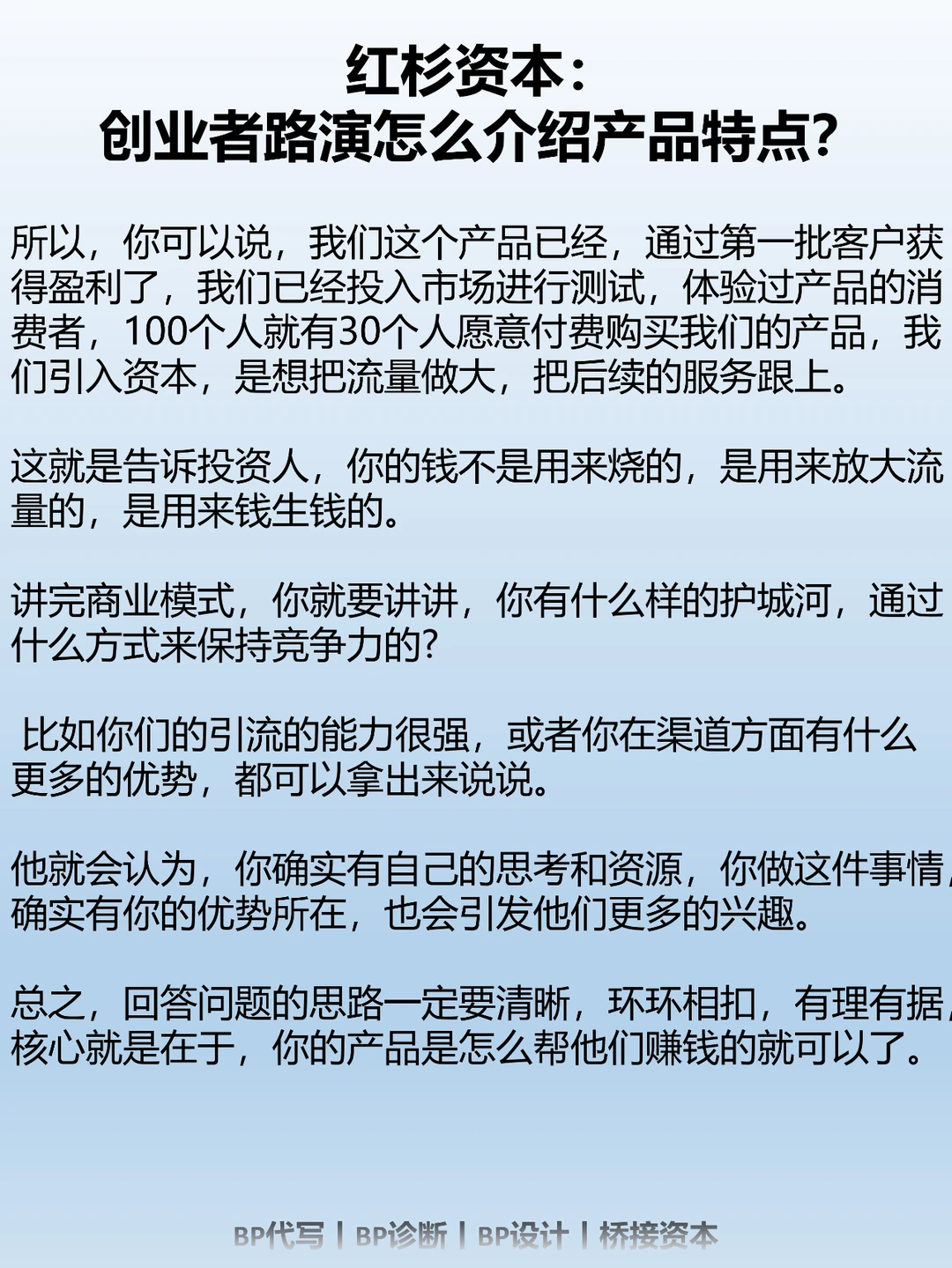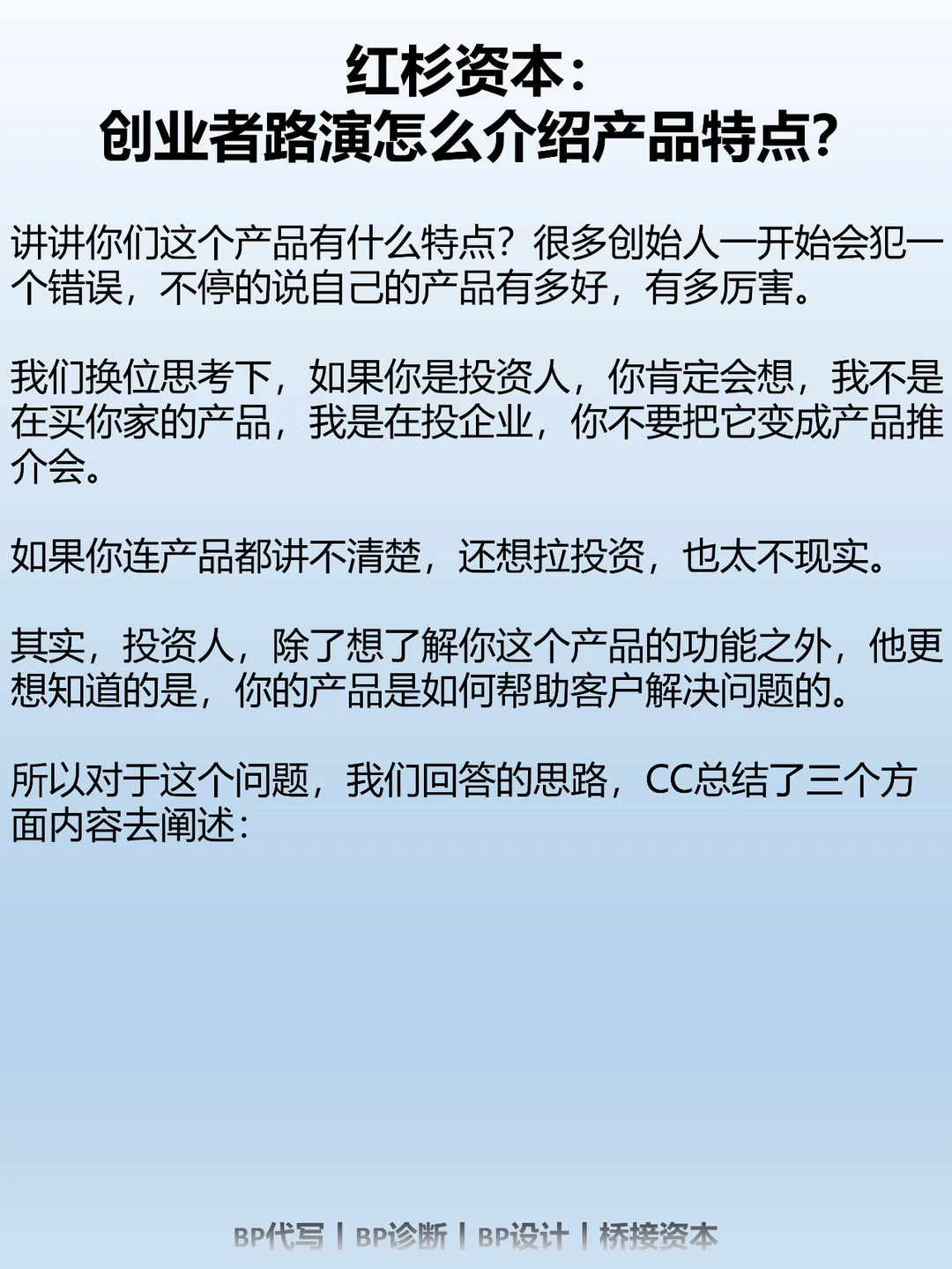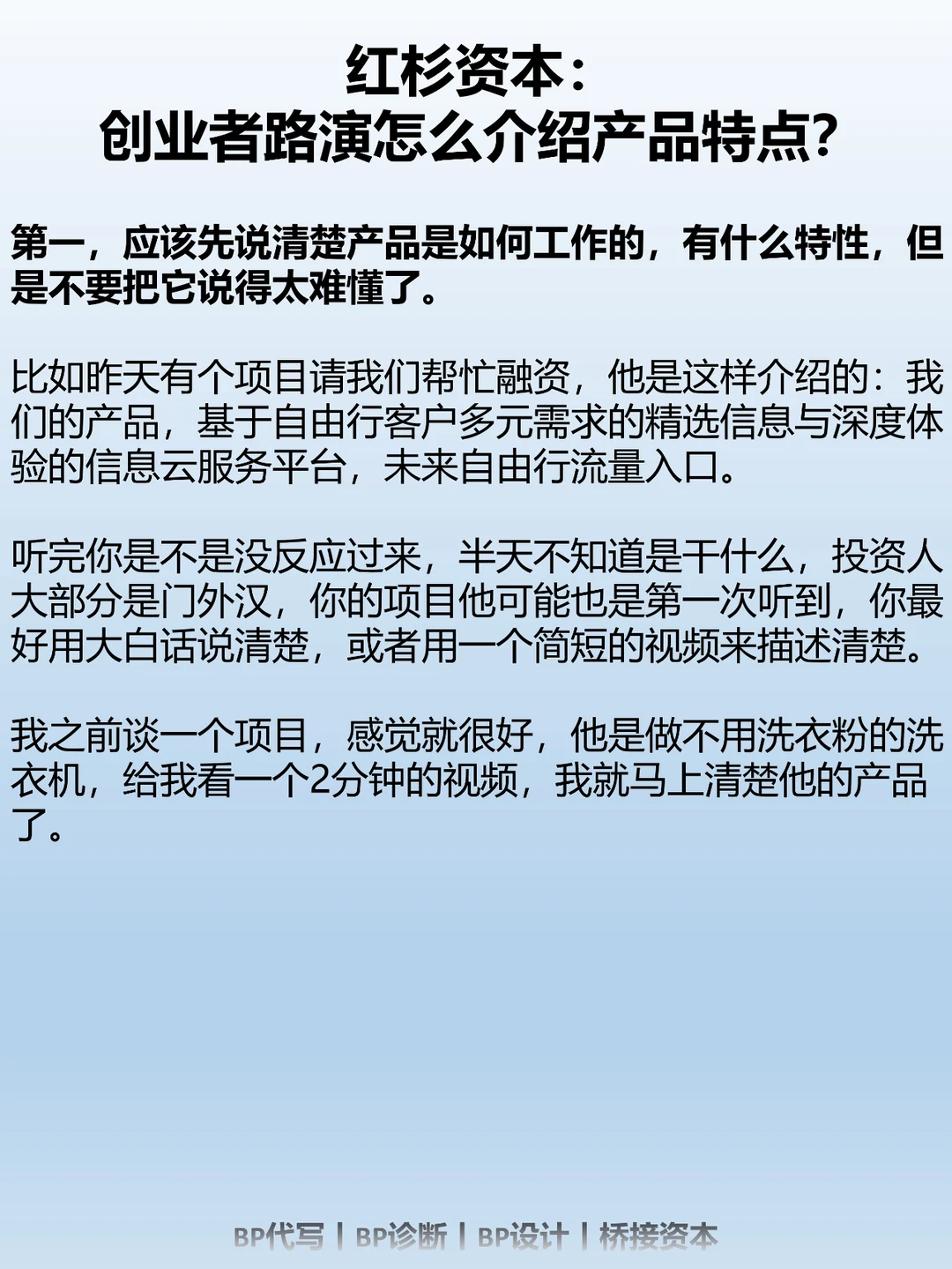 我们换位思考下,如果你是投资人,你肯定会想,我不是在买你家的产品,我是在投企业,你不要把它变成产品推介会。