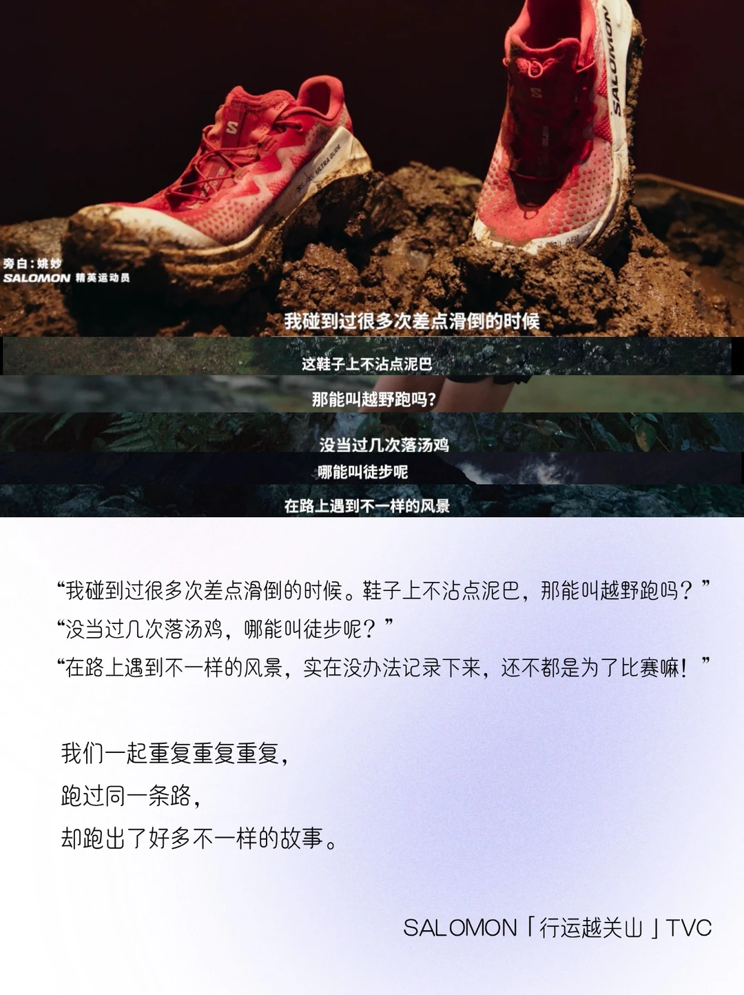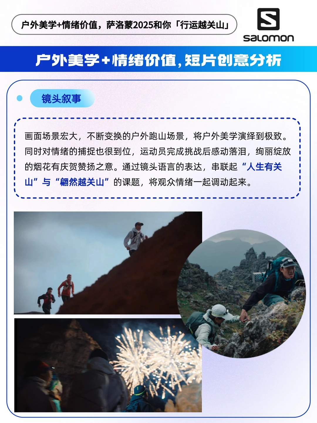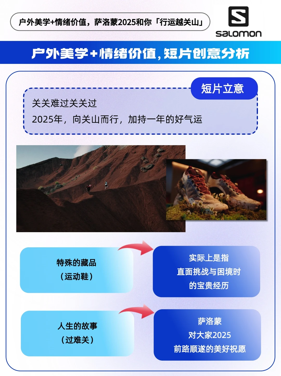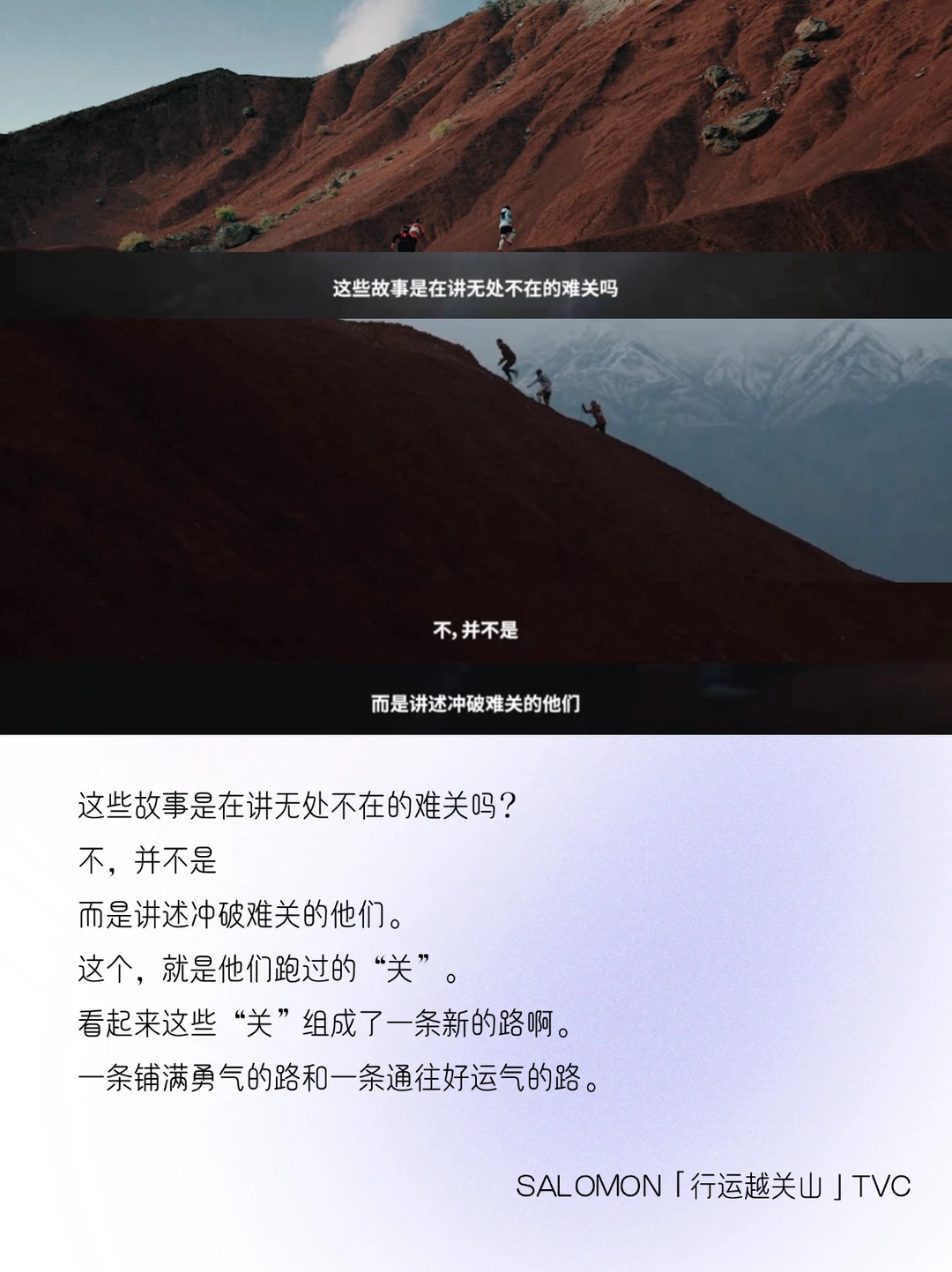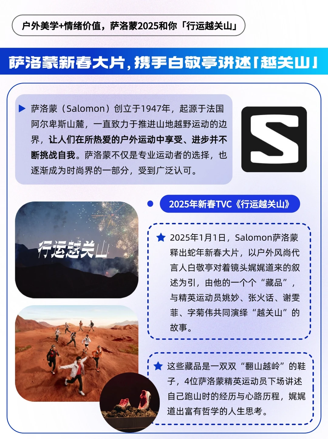 - “关关难过关关过”,这句话,曾点亮多少人黎明前的黑夜。 在2025伊始,Salomon萨洛蒙释出一条蛇年新春大片,以户外风尚代言人白敬亭对着镜头娓娓道来的叙述为引,由他的一个个“藏品”,与精英运动员姚妙、张火话、谢雯菲、字菊伟共同演绎“越关山”的故事。 ⛰️「行运越关山」,此处的「关山」,象征着人生中的各种挑战和目标。它可以是攀一座山、走更远的路、见更美的风景…… 生活中的“关山”无处不在,每个人都需要面对和克服这些“关山”,而每一次的突破都是与自我的较量,不断积攒力量、迎接更美好的未来。 🔵情绪文案: 以“藏品”为引,讲述那些闯过的关,也必将汇成全新的路。文案简短却铿锵有力,富有哲学的表达带读者入局,在2025年在辞旧迎新的关口前,引发思考与共鸣,给人以力量。 🔵镜头叙事: 画面场景宏大,不断变换的户外跑山场景,将户外美学演绎到极致。同时对情绪的捕捉也很到位,运动员完成挑战后感动落泪,绚丽绽放的烟花有庆贺赞扬之意。通过镜头语言的表达,串联起“人生有关山”与“翩然越关山”的课题,将观众情绪一起调动起来。 每个人心中都有一座“关山”,而那些闯过的关,也必将汇成全新的路,指引我们步伐更稳地前进。 新的一年,祝你祝我祝大家, 前路顺遂,“行运越关山”![烟花R]