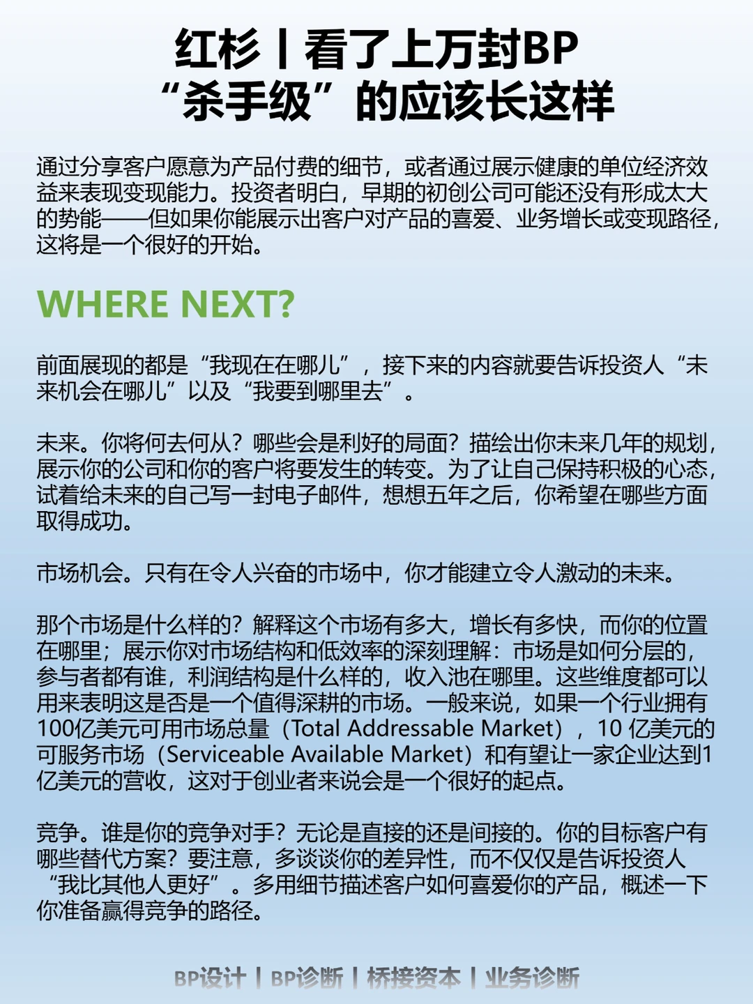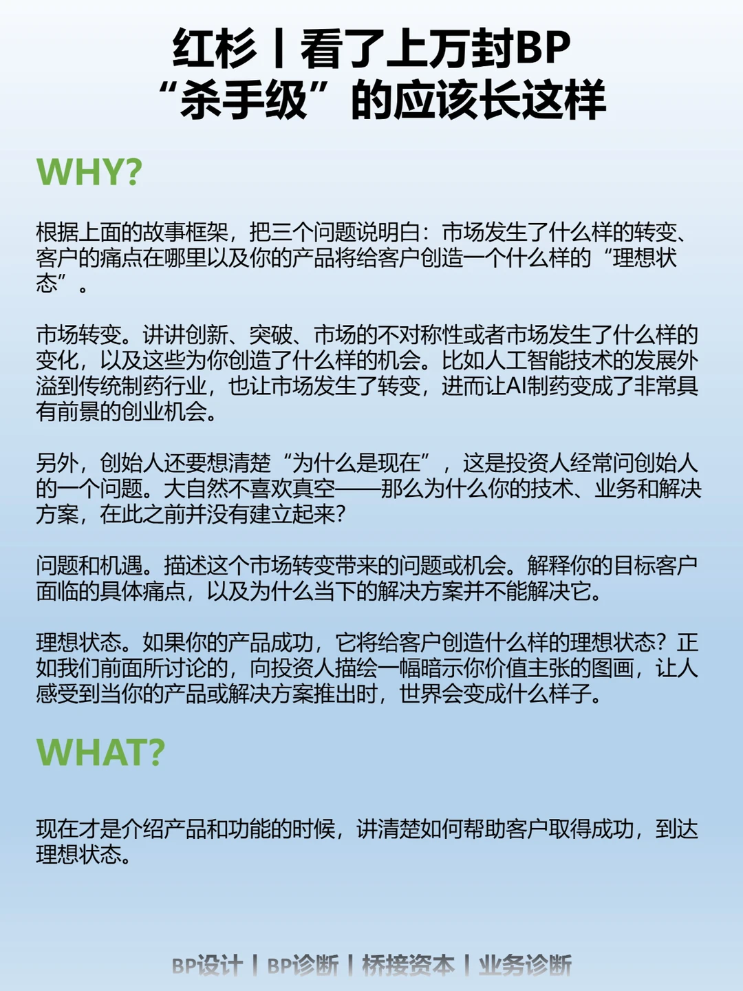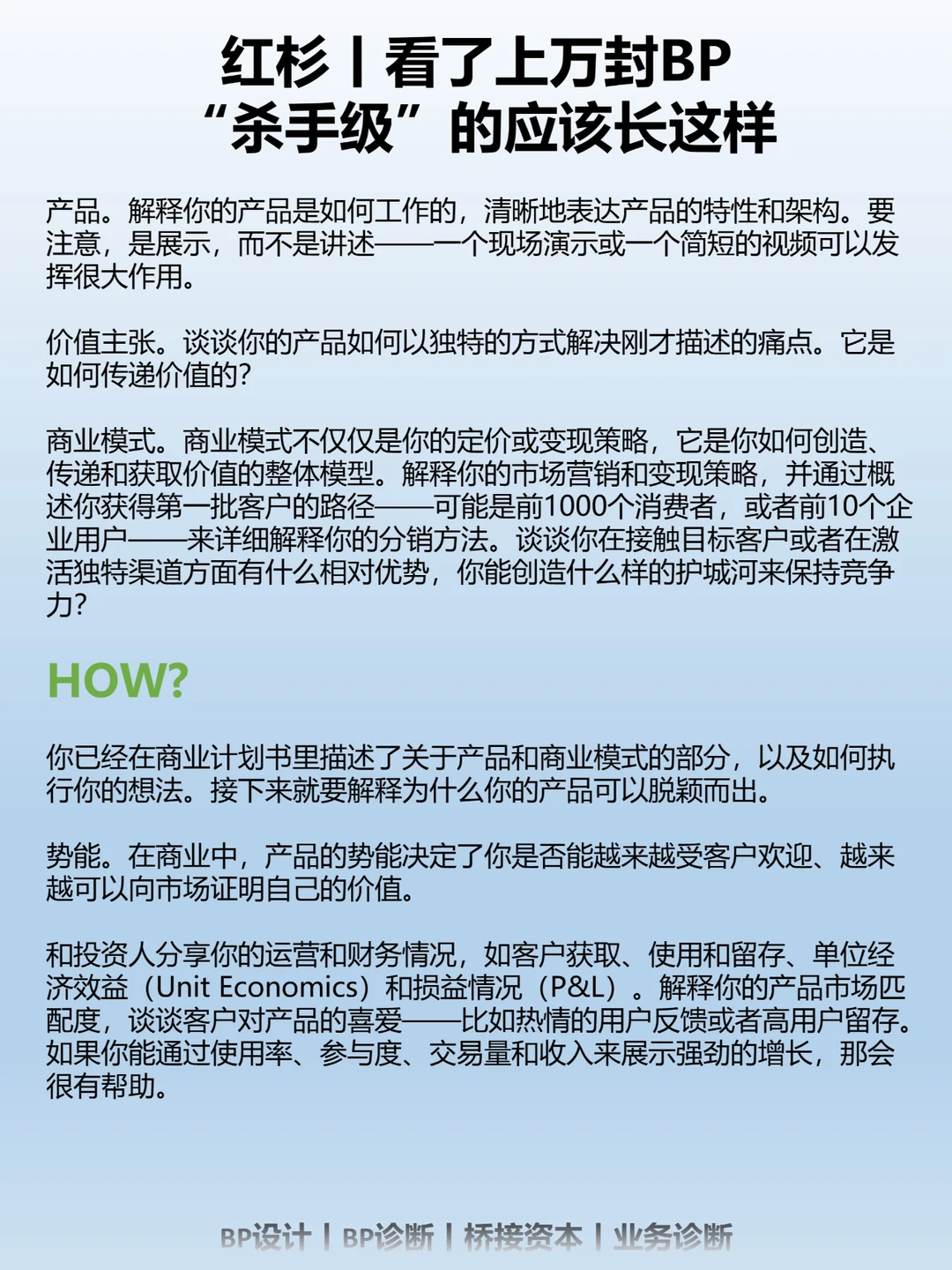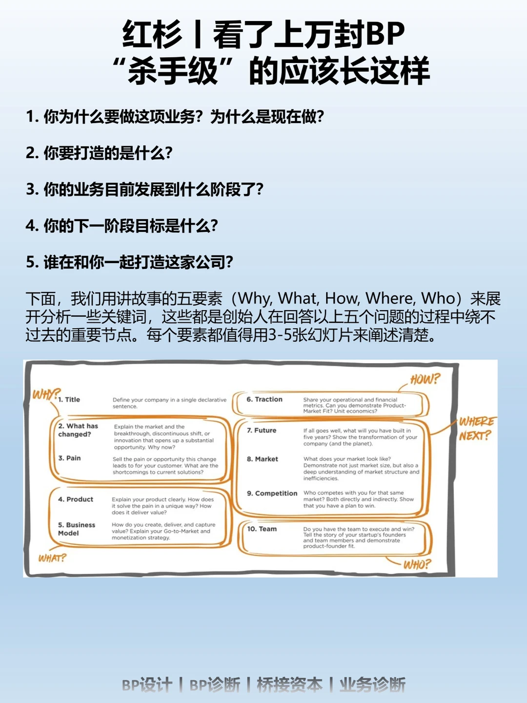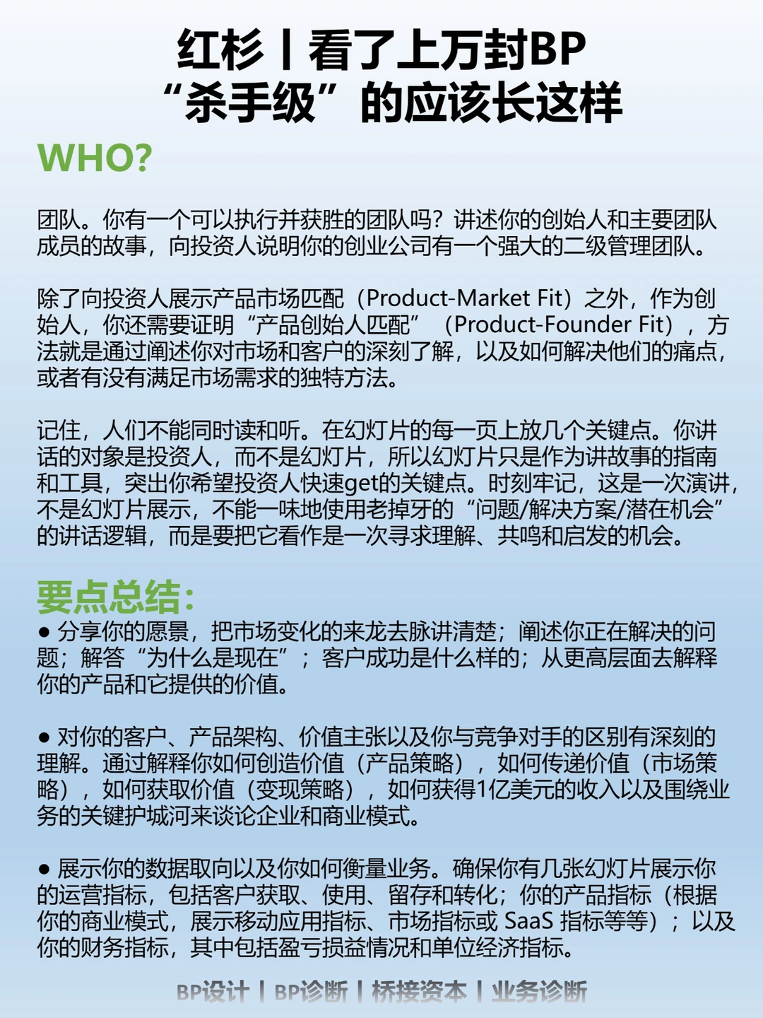 无效的BP各有不同,但有效的BP往往有不少共同点。以下就是我们在一些优秀早期创始人分享的商业计划书整理出的共性,它们都是被着墨最多的地方。