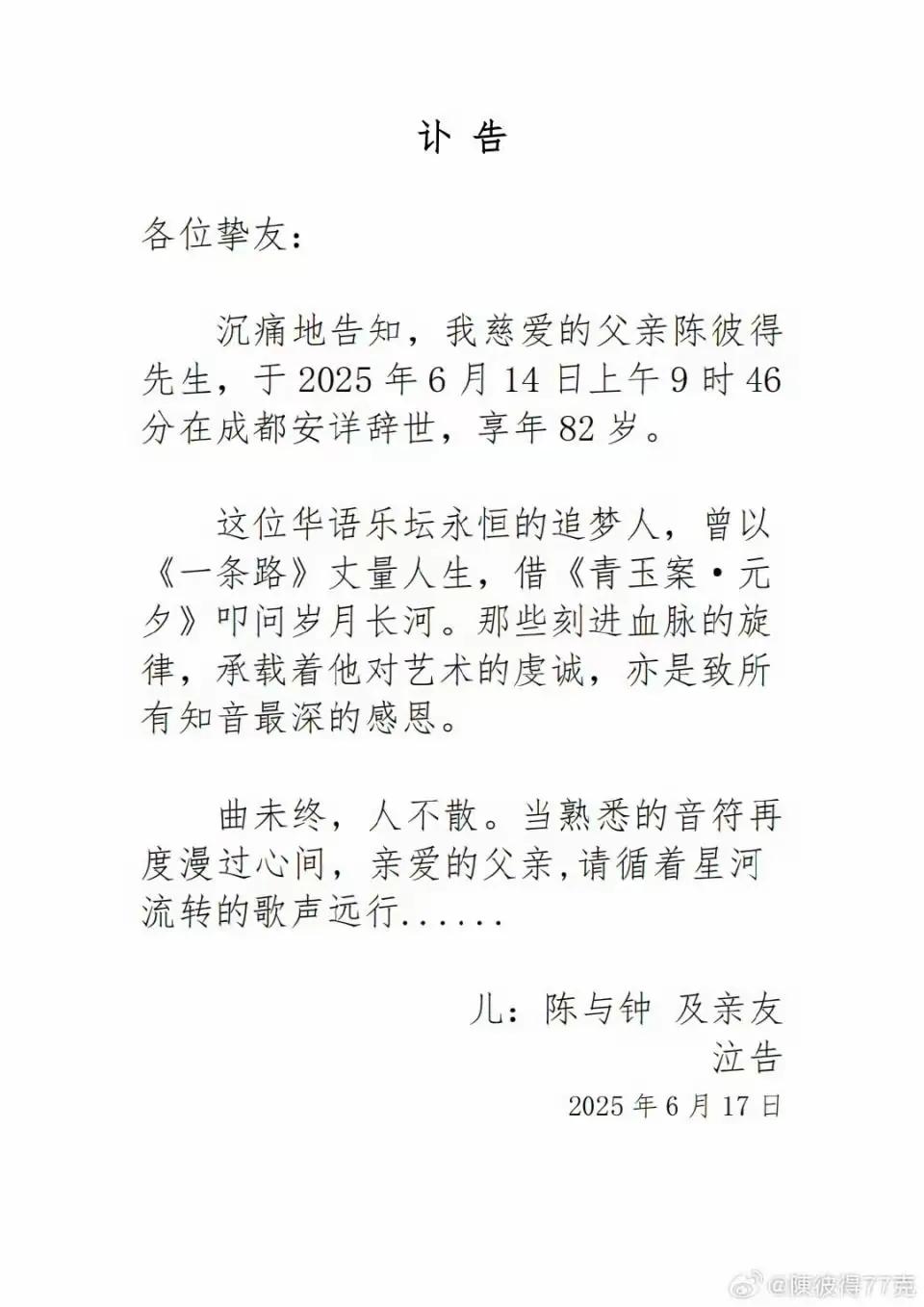 2025年6月17日上午,陈彼得家人发布讣告,称陈彼得先生于2025年6月14日上午9时46分在成都安详辞世,享年82岁。 陈彼得原名陈晓因,1943年8月12日出生于四川成都,祖籍广东潮阳,长于中国台湾眷村。1971年,他以专辑《玫瑰安娜》正式出道。他是台湾最早引入西方摇滚、R&B元素的音乐人,在台湾乐坛甜美情歌风行之时,大胆创新,引领了台湾流行音乐潮流,被誉为“台湾流行音乐教父”。他创作了《迟到》《一条路》《阿里巴巴》《几度夕阳红》等近千首歌曲,还为中华古诗词谱曲,如《青玉案·元夕》。此外,他还积极参与文化交流活动,2019年春节期间,在央视快闪系列活动中深情演唱《我和我的祖国》,成为感动中国2019候选人物。