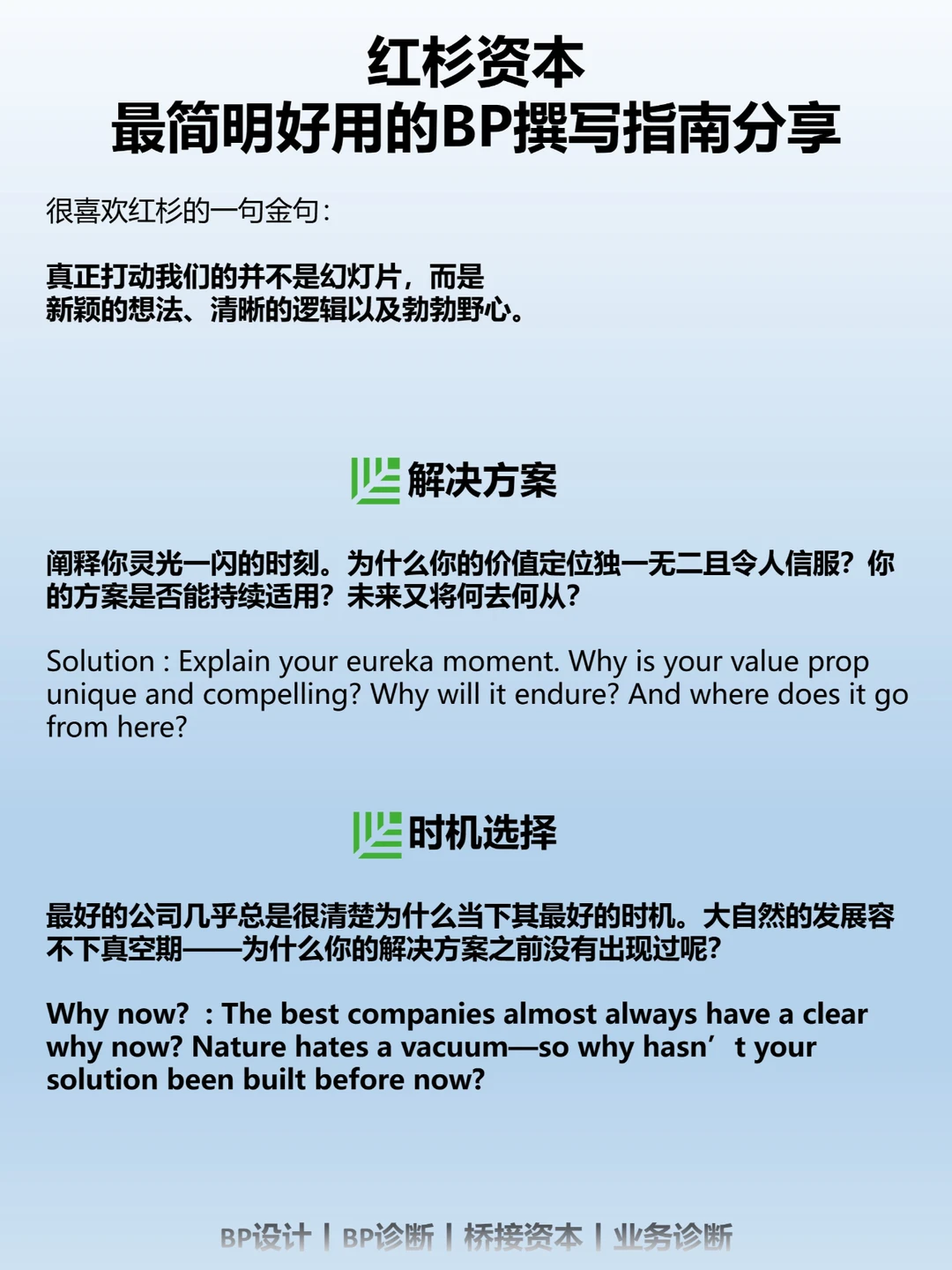 阐释你灵光一闪的时刻。为什么你的价值定位独一无二且令人信服?你的方案是否能持续适用?未来又将何去何从?