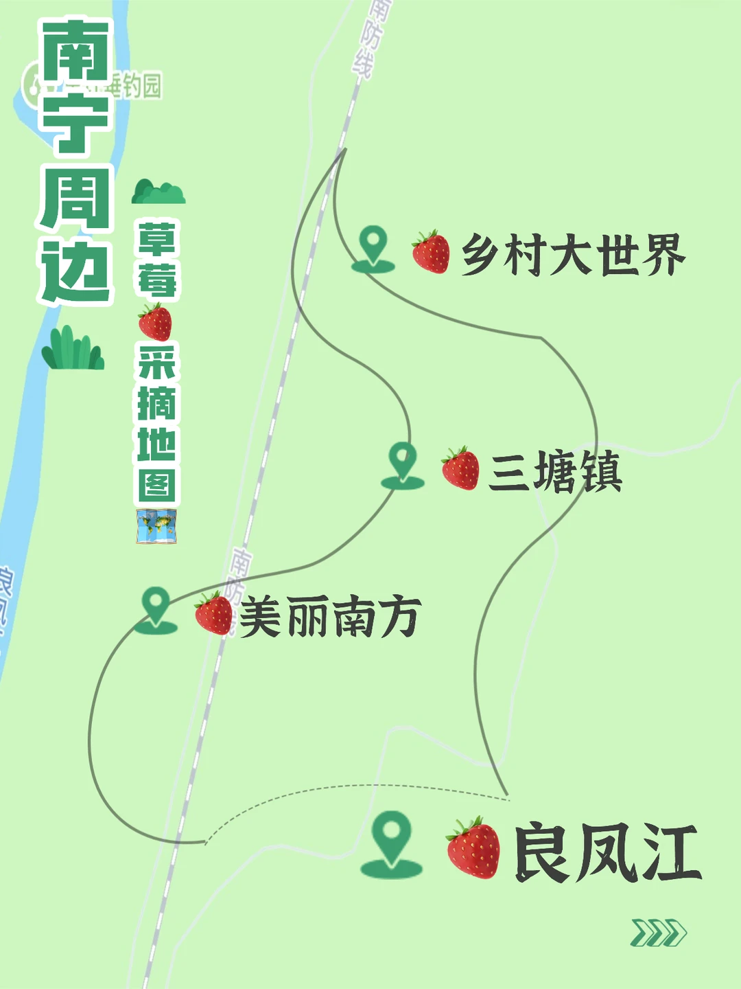 在南宁,终于等到12月草莓季上线了! 一颗颗饱满通红的草莓🍓挂在藤蔓上 酸甜香气直钻鼻腔,隔着屏幕都流口水~ 今天专门整理了一篇南宁周边采摘路线合集🗺️ 是我去过还想再去的宝藏地!有需要的朋友赶紧先🐎起来~ · 1️⃣江南区良凤江附近 🍓采摘类别:草莓 🔥推荐指数:⭐️⭐️⭐️⭐️⭐️ 🎫:采摘30r/斤 开车约1h即可到达,路况超顺不绕路,草莓饱满圆润、色泽鲜亮,摘起来超有成就感~而且他的奶油草莓品种很香甜又大个!真心推荐👍🏻连娃都炫到停不下来 🌟其他:窑鸡、红薯、烧烤等⛺️、适合遛娃 - 2️⃣乡村大世界附近 🍓采摘类别:草莓 🔥推荐指数:⭐️⭐️⭐️⭐️⭐️ 🎫:采摘38r/斤 开车约50min抵达,园里有草莓、番茄、圣女果和甘蔗可摘,甘蔗很甜,水分超足🥰自驾很便利,主打一个体验感。自己带篮子去会很出片! 🌟其他:窑鸡、红薯、烧烤、露营等 - 3️⃣美丽南方附近 🍓采摘类别:草莓 🔥推荐指数:⭐️⭐️⭐️⭐️ 🎫:采摘35r/斤 开车40分钟直达的亲子采摘宝地㊙️一进园就被满眼的红草莓治愈了!个头挺大的,摘起来超有成就感~附近还有儿童游乐设施,可以玩尽兴! 🌟其他:窑鸡、烧烤、露营、儿童乐园等 - 4️⃣三塘镇附近 🍓采摘类别:草莓 🔥推荐指数:⭐️⭐️⭐️⭐️ 🎫:采摘30r/斤 除了摘草莓🍓附近还能挖红薯、喂小动物、烧烤、窑鸡…很适合遛娃! 🌟其他:甘蔗、菜园、农家乐等 - 🌈遛娃采摘Tips: ✅穿耐脏的衣服和鞋子 ✅带湿巾、纸巾(摘完直接吃超方便) ✅挑选草莓选通体通红、果蒂新鲜的,甜度更高 ✅防晒防蚊不能少!冬季午后阳光也很晒 ✅可以自带小篮子拍照,出片率翻倍📸 ✅摘的时候轻拿轻放,避免捏坏果实 ✅出发前打📲确认当天是否开放,避免白跑一趟 · 南宁周末遛娃胜地持续更新中✌🏻