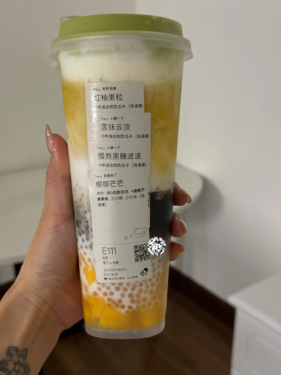 加了两份小料会自动升超大杯 !!! 椰椰芒芒➕冰沙➕少少甜➕苦抹云顶➕慢熬黑糖波波➕红柚果粒➕加倍芒果果肉 一口回到了5年前了 全是料好满足