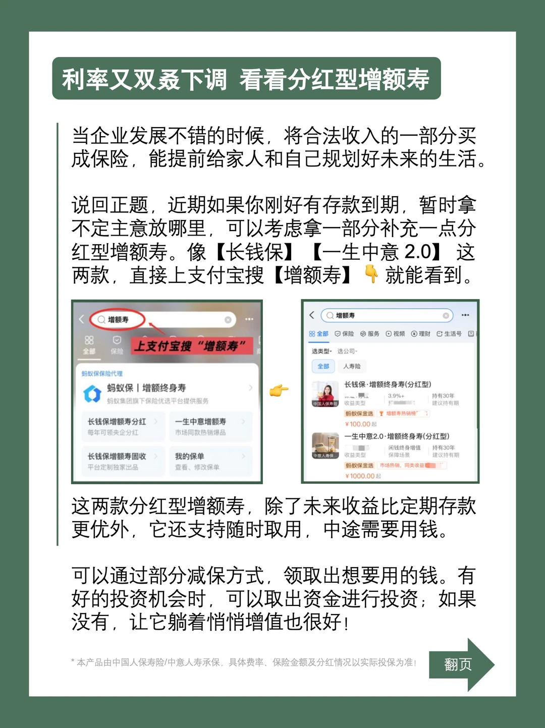 近期如果你刚好有存款到期,暂时拿不定主意放哪里,可以考虑拿一部分补充一点分红型增额寿。直接上支付宝搜【增额寿】 就能找到。