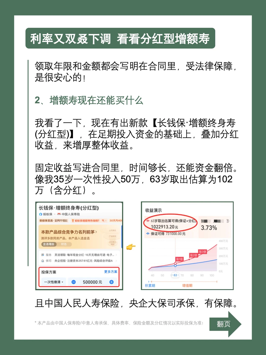 我看了一下,现在有出新款【长钱保·增额终身寿(分红型)】,在足期投入资金的基础上,叠加分红收益,来增厚整体收益。固定收益写进合同里,时间够长还能资金翻倍。像我35岁一次性投入50万,63岁取出估算为102万(含分红)。且中国人民人寿保险,央企大保司承保,有保障。