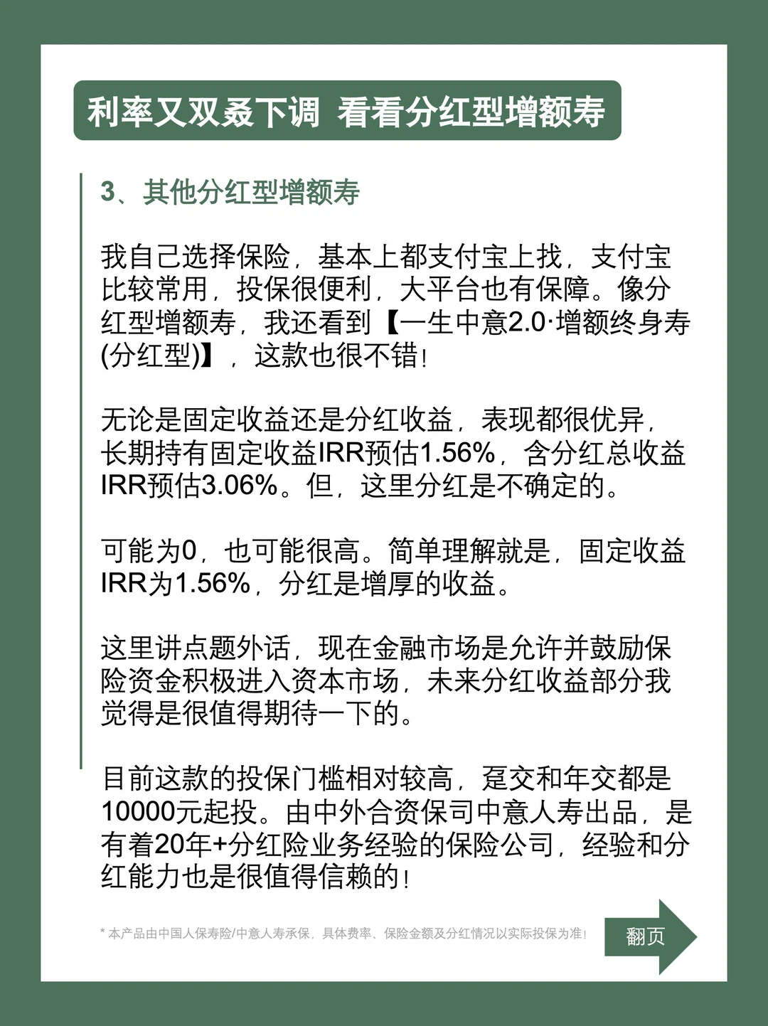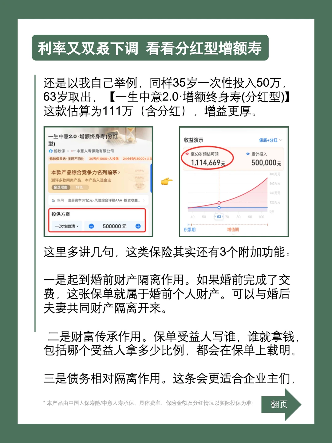 我选保险,基本上都支付宝上找,投保便利,大平台也有保障。分红型增额寿我还看到【一生中意2.0·增额终身寿(分红型)】也很不错!由中外合资保司中意人寿出品,经验和分红能力都很值得信赖!无论是固定收益还是分红收益,表现都很优异。同样35岁一次性投入50万,63岁取出估算为111万(含分红)。
