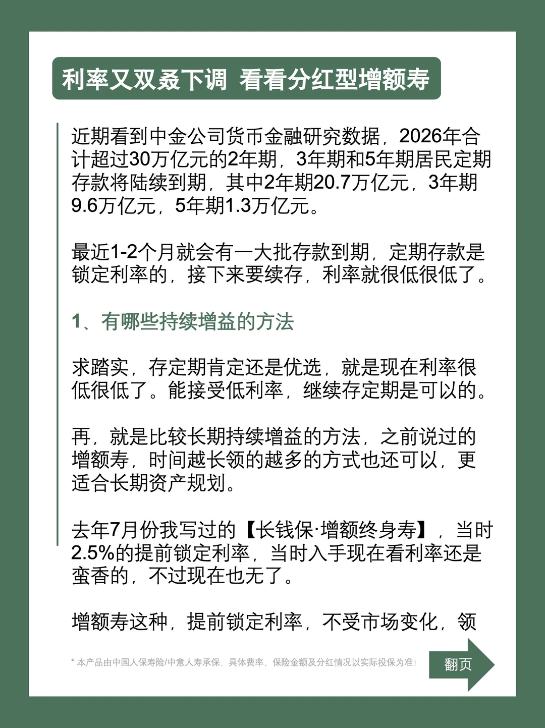 求踏实,能接受低利率,继续存定期还是可以的。再就是比较长期持续增益的方法,像之前说过的增额寿,时间越长领的越多的方式也还可以,更适合长期资产规划。去年7月份我写过的【长钱保·增额终身寿】,当时2.5%的提前锁定利率,当时入手现在看利率还是蛮香的,不过现在也无了。增额寿这种提前锁定利率,不受市场变化,领取年限和金额都会写明在合同里,受法律保障,是很安心的!