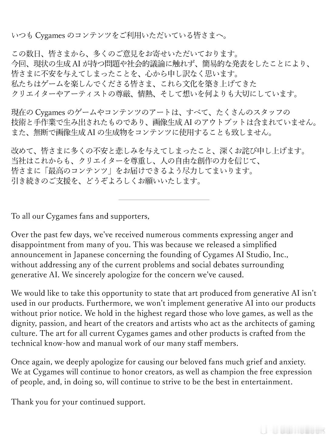 【“二游巨佬”Cygames成立AI子公司,开心没几天就认怂:发公开信“灭火”网页链接】日本知名游戏开发商 Cygames 于 1 月 9 日正式宣布,已成立全资子公司“Cygames AI Studio”。这一举措标志着这家曾打造出《赛马娘 Pretty Derby》和《碧蓝幻想》等现象级作品的娱乐巨头,正式将人工智能技术从单纯的辅助工具升级为企业核心战略的一部分。