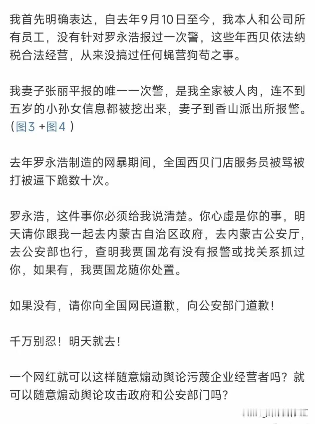 老贾这篇博文怎么看怎么都是主动上纲上线啊! 老罗和老贾这件事儿吧,实际上并不是针对于老贾个人。老罗只是针对于预制菜这一个不健康的或有待于论证的这么一种事件。相信老罗也并没有针对老贾。同时广大的人民群众也没有多少人会认为老罗跟老贾有仇。更不会有人认为老罗把老贾家的孩子扔井里了。 所以当老罗提出对预制菜的质疑的时候,老贾把老罗绑上道德的战车。这个是可以的。但是你并不能把老罗绑上污蔑政府无视公安的这么一辆车。 这种情况就显得太上纲上线了。反而会让人觉得老贾的这一篇文章是在有意挑起老罗和政府与公安之间的矛盾关系。 作为任何一个企业,他所面对的是客户,那么他就需要接受客户的监督! 如果老贾他要一直认为自己的预制菜是没有问题的。那么他为什么曾经提出给老罗免单? 预制菜既然没错,为什么要给一个顾客免单呢?这不就相当于很早就已经低头认错了吗?只不过是老罗对于这件事情来讲,我觉得是压住了。要是凭借老罗以往的口才恐怕10个老贾,100个老贾都够呛对付得了! 老罗就凭一个段子,就能够完胜老贾100篇小作文。 我的建议是二人化干戈为玉帛,既然这件事情都过去了,消失在民众的事业当中了。这事就真的过去了。 至于企业门店关闭了上百家,大不了从头再来。真心的希望老罗和老贾你俩人也别握手言和,因为你俩人根本就水火不同炉,见不了面。 彼此在互联网上相互支应一声。相逢一笑泯仇吧。罗永浩 贾国龙